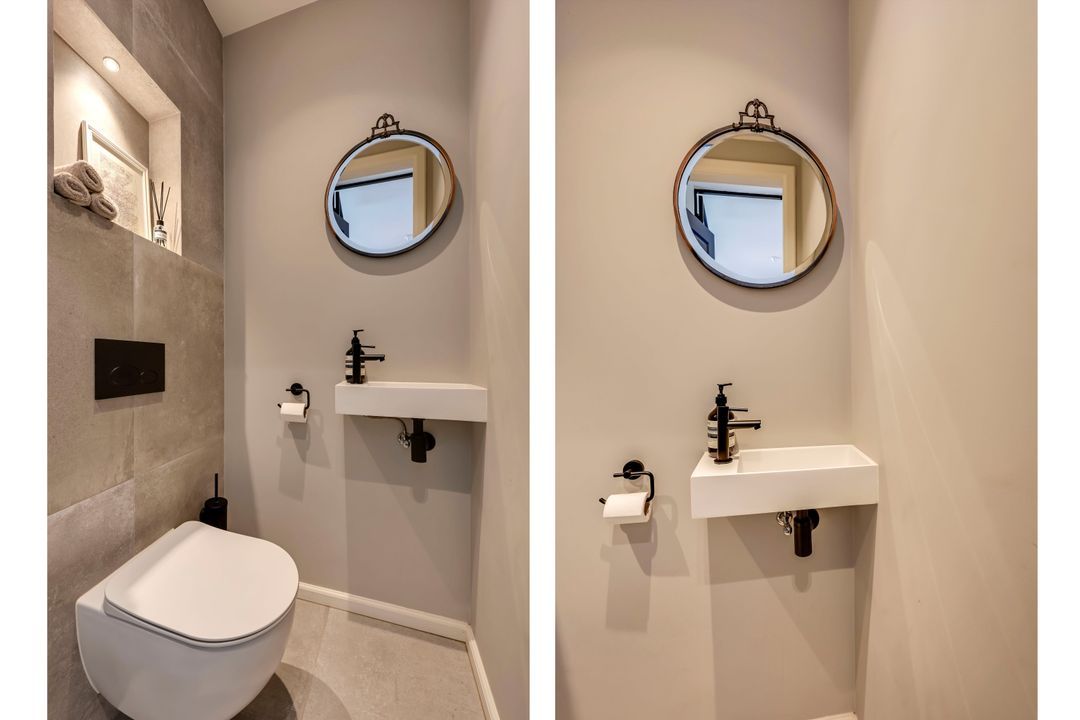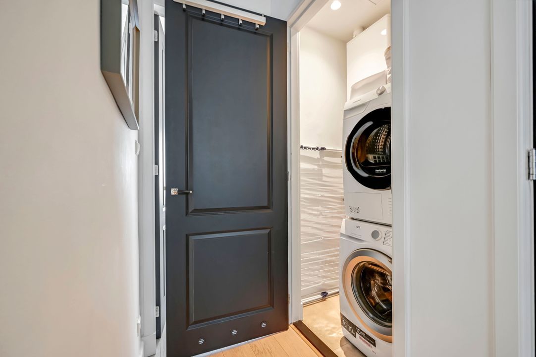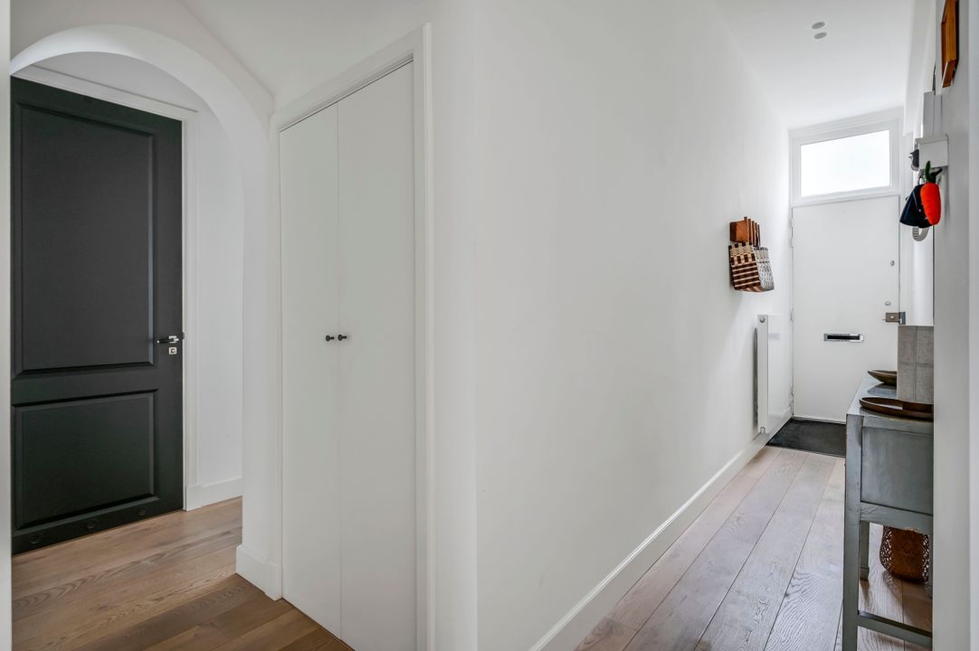 Entree appartement, gang, modern vrijhangend toilet met fontein, vaste kast met wasmachine-/droger aansluiting en opstelplaats c.v.-ketel.