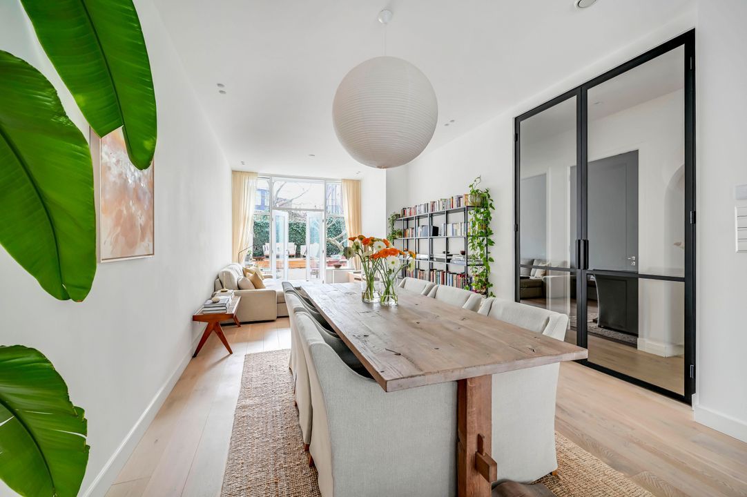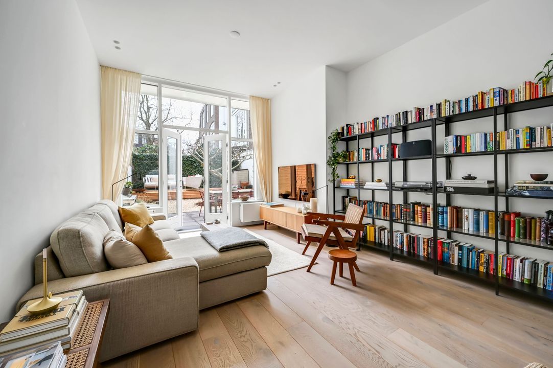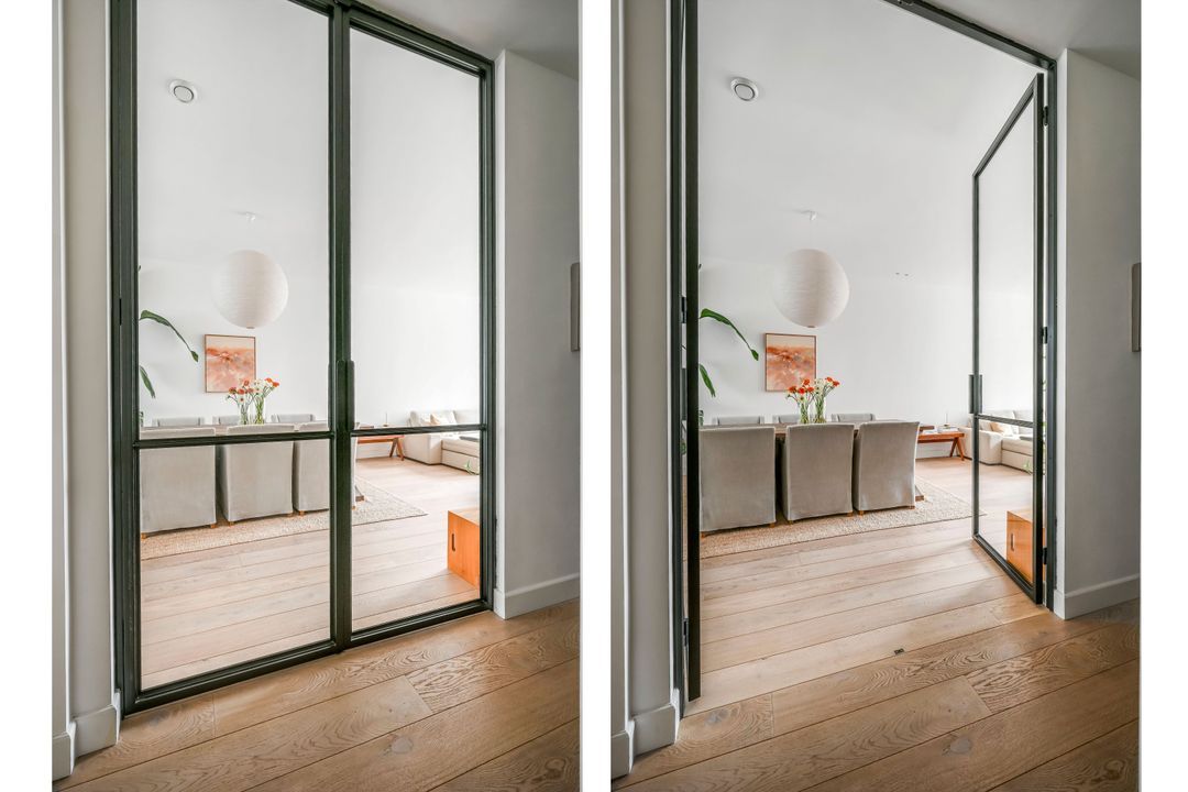 High steel French doors lead into the spacious living room, with a luxurious open-plan kitchen at the front, equipped with various built-in appliances, including a Bora induction cooktop with integrated extractor fan, dishwasher, fridge/freezer, and combination oven/microwave.