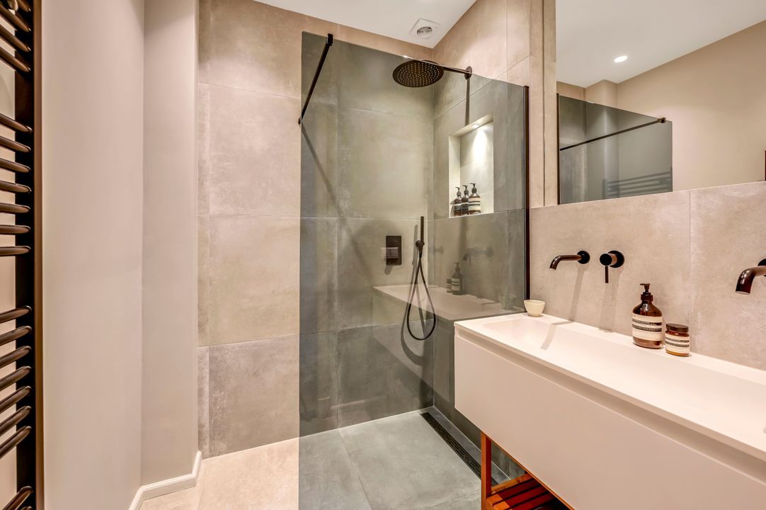 Moderne badkamer voorzien van inloopdouche, dubbel wastafelmeubel, vloerverwarming en design radiator.