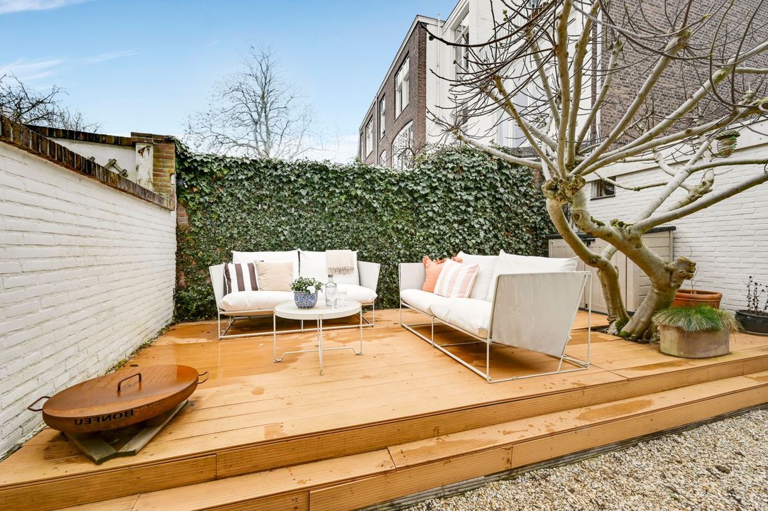 Via dubbele deuren toegang naar heerlijke zonnige achtertuin op het zuiden met verhoogd terras voorzien van composiet vloerdelen.