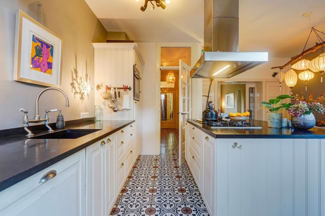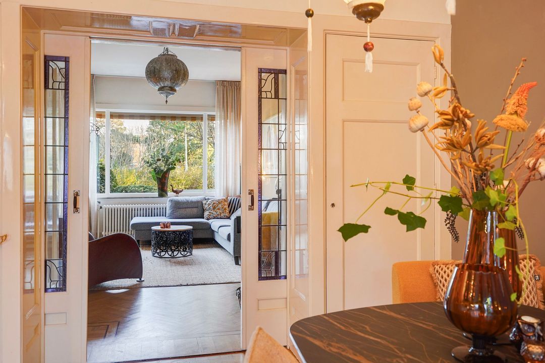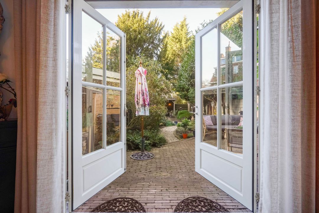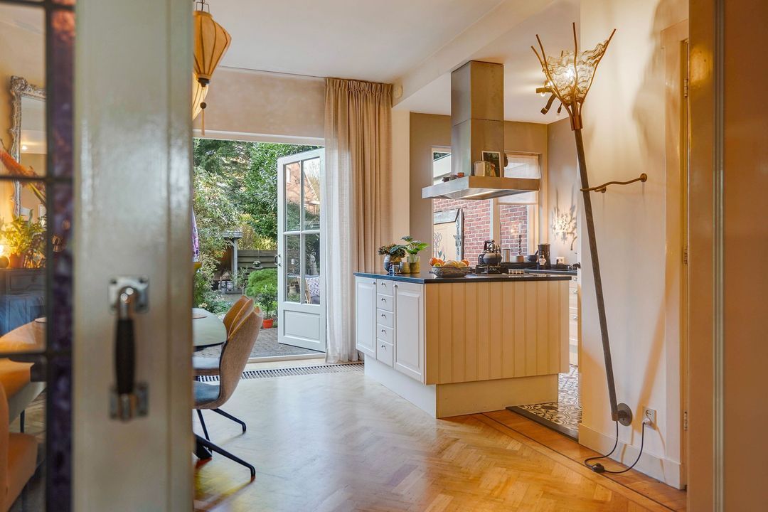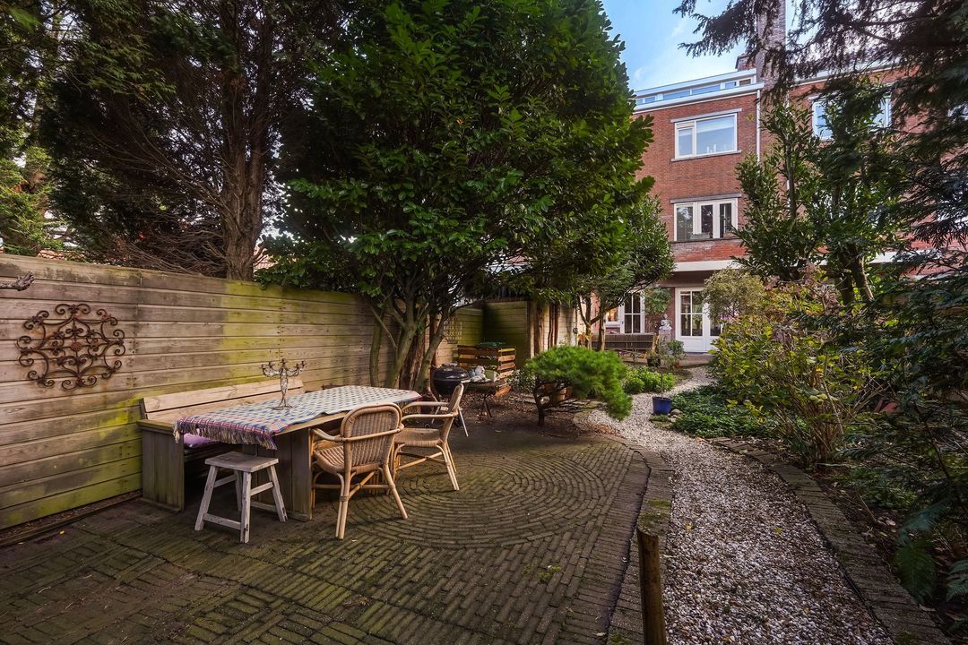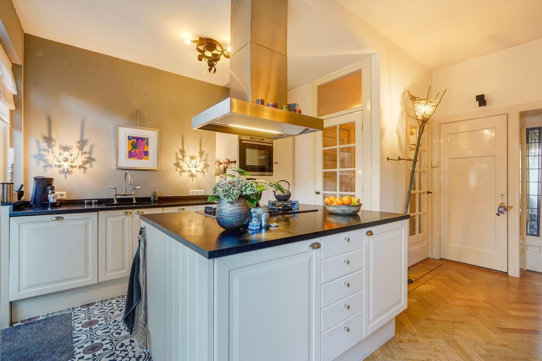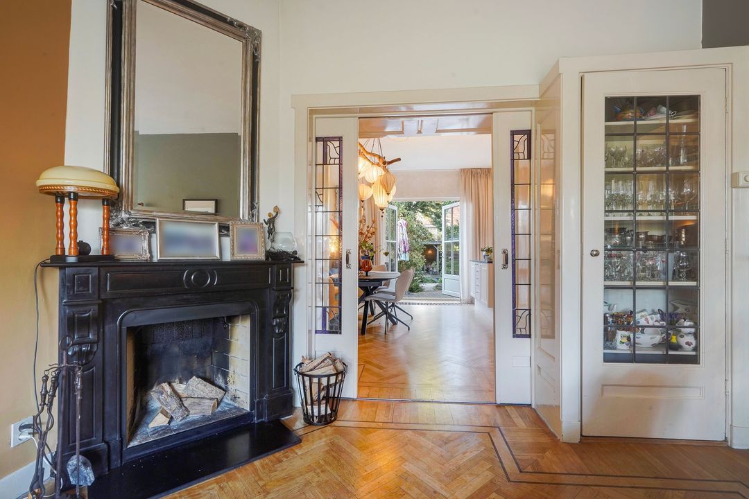 Voortuin met verzonken fietsenberging en portaal, entree met de originele voordeur, vestibule met fraaie granieten vloer, voorzien van ornament en tochtseparatie, gang met een fraaie tegelvloer doorgelegd in de keuken, toegang naar een ruime kelder opgedeeld in 2 ruimtes, sfeervolle kamer ensuite voorzien van schuifseparatie met glas in lood en 3 vaste kasten, 2 zwart marmeren schouwen met gas- en hout openhaard, visgraatparketvloer en open klassieke keuken met een kookeiland voorzien van 5 pits gasfornuis en afzuigkap, verder een recht keukenblok met combi magnetron, koel/vrieskast, verzonken spoelbak en vaatwasser. Beide keukenblokken zijn voorzien van een zwart natuurstenen aanrechtblad. Riante achtertuin van ruim 20 meter diep, voorzien van 2 terrassen en een veranda.