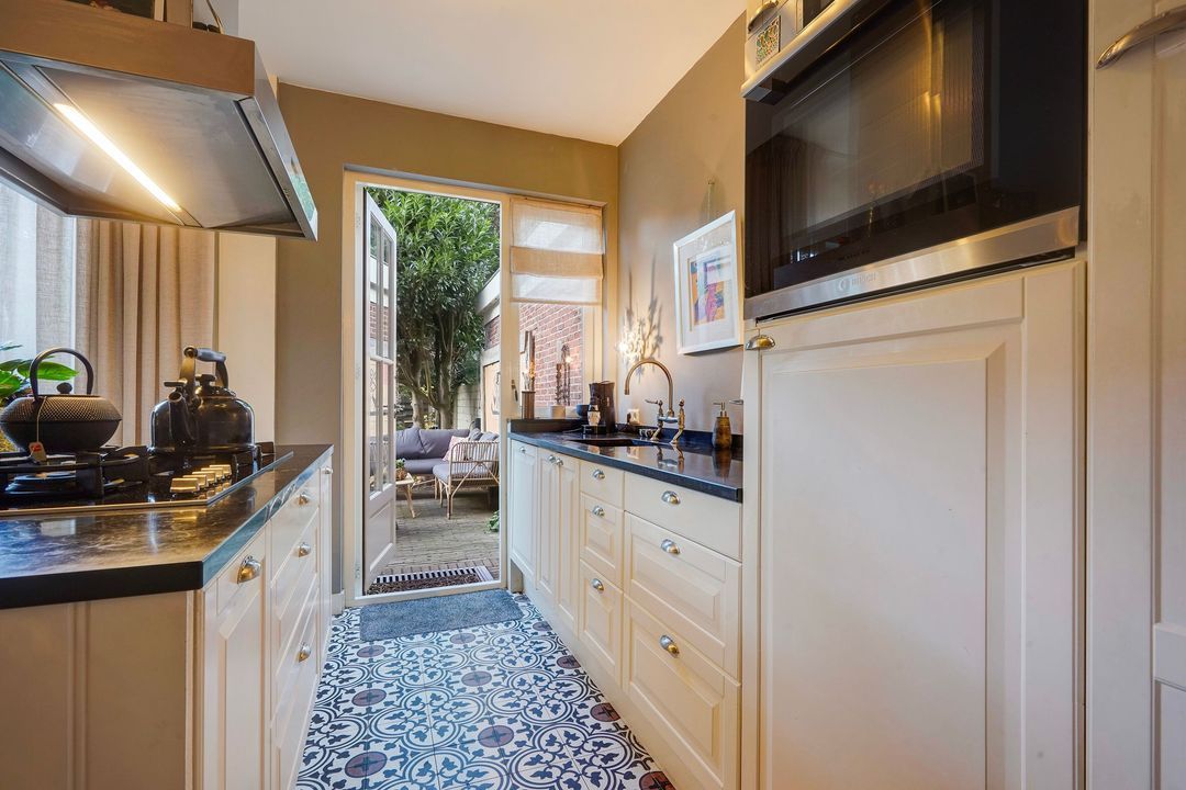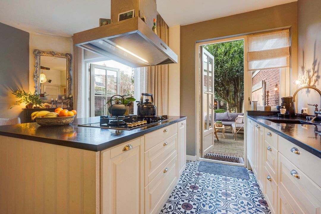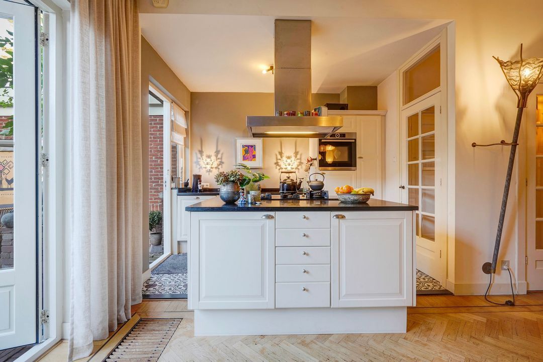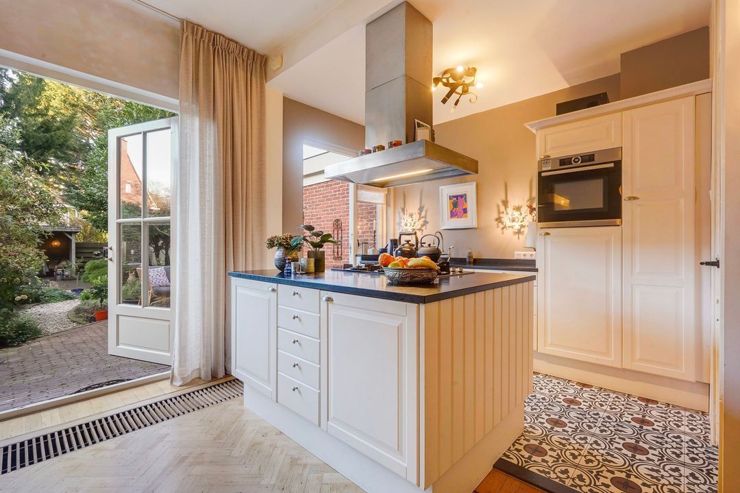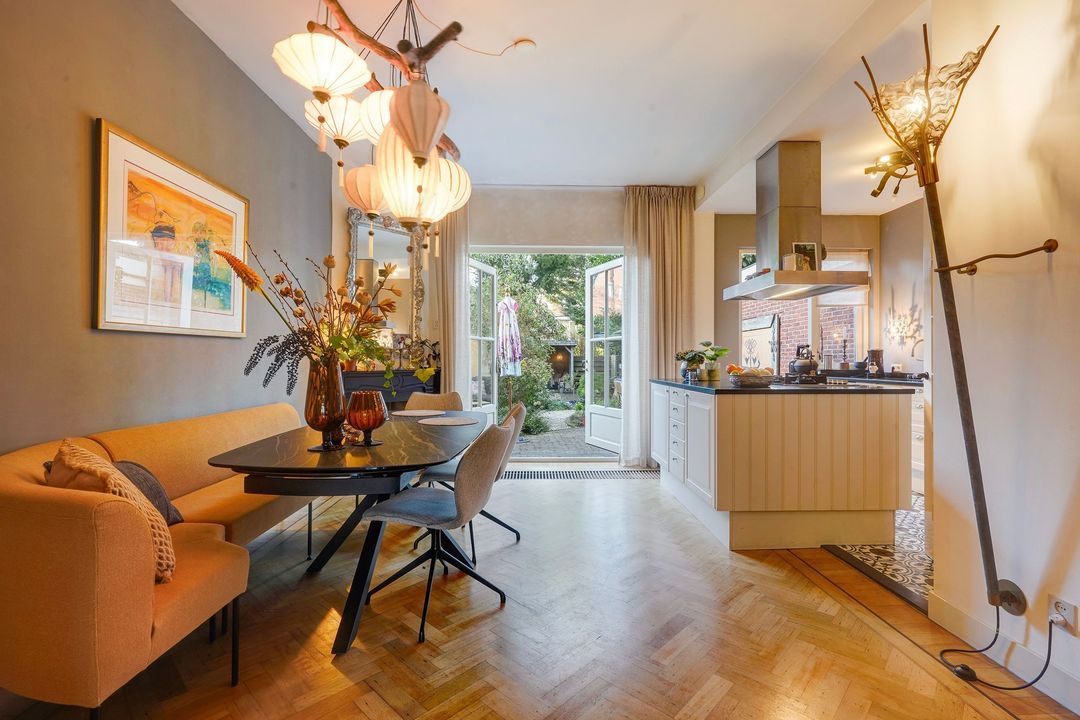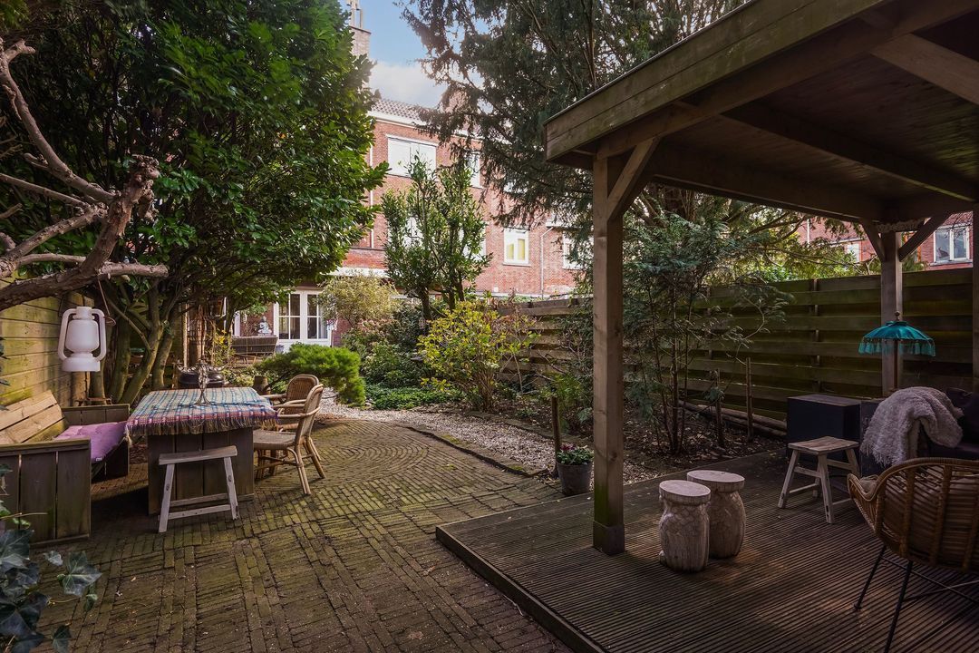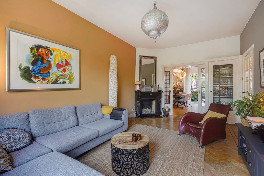 Voortuin met verzonken fietsenberging en portaal, entree met de originele voordeur, vestibule met fraaie granieten vloer, voorzien van ornament en tochtseparatie, gang met een fraaie tegelvloer doorgelegd in de keuken, toegang naar een ruime kelder opgedeeld in 2 ruimtes, sfeervolle kamer ensuite voorzien van schuifseparatie met glas in lood en 3 vaste kasten, 2 zwart marmeren schouwen met gas- en hout openhaard, visgraatparketvloer en open klassieke keuken met een kookeiland voorzien van 5 pits gasfornuis en afzuigkap, verder een recht keukenblok met combi magnetron, koel/vrieskast, verzonken spoelbak en vaatwasser. Beide keukenblokken zijn voorzien van een zwart natuurstenen aanrechtblad. Riante achtertuin van ruim 20 meter diep, voorzien van 2 terrassen en een veranda.