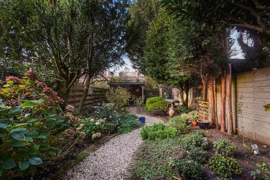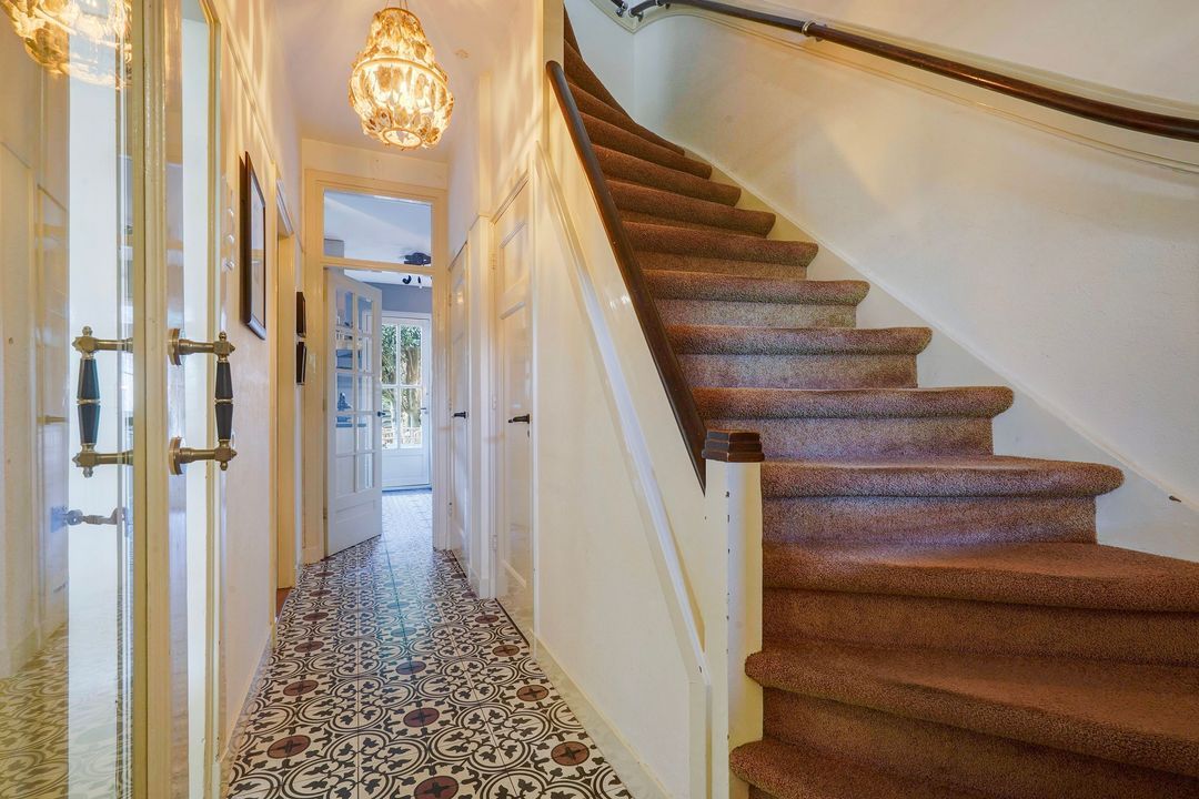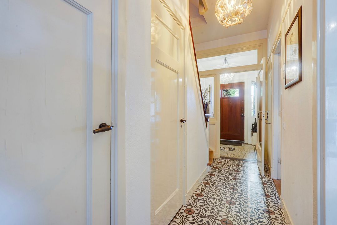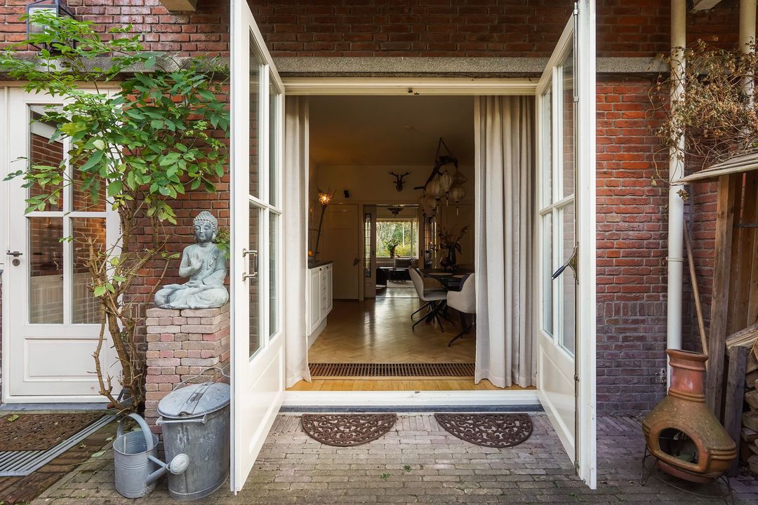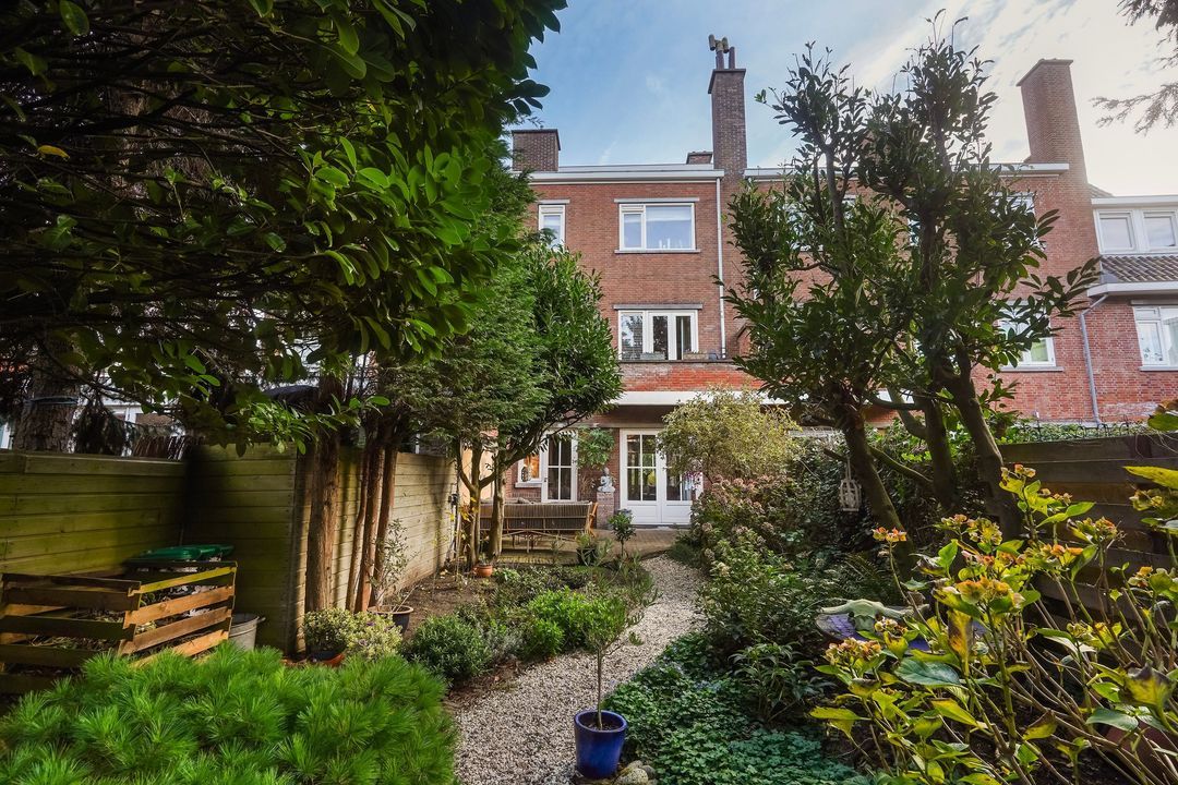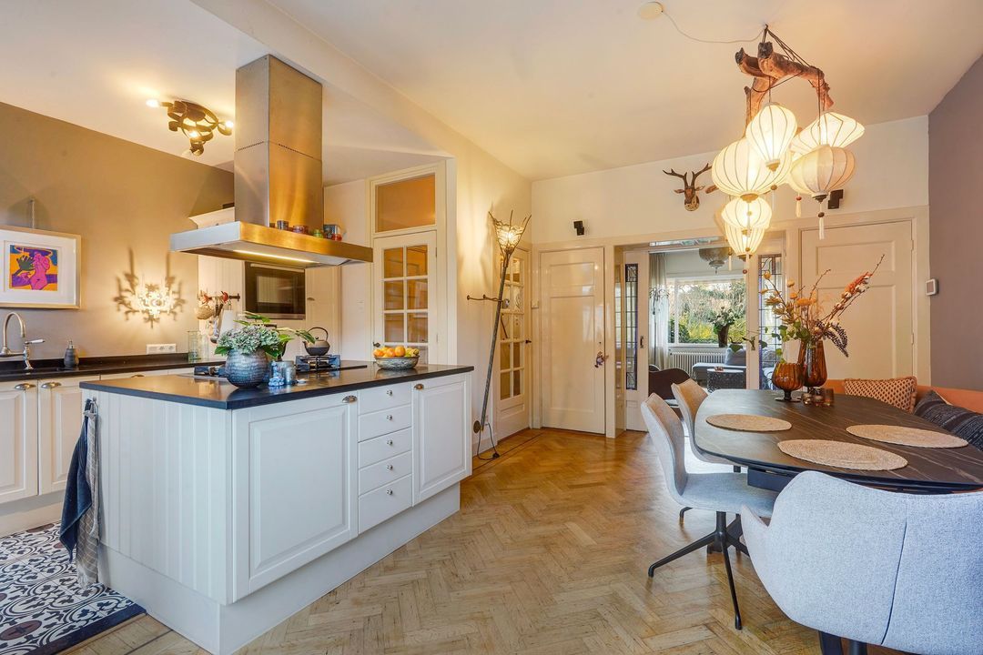 Voortuin met verzonken fietsenberging en portaal, entree met de originele voordeur, vestibule met fraaie granieten vloer, voorzien van ornament en tochtseparatie, gang met een fraaie tegelvloer doorgelegd in de keuken, toegang naar een ruime kelder opgedeeld in 2 ruimtes, sfeervolle kamer ensuite voorzien van schuifseparatie met glas in lood en 3 vaste kasten, 2 zwart marmeren schouwen met gas- en hout openhaard, visgraatparketvloer en open klassieke keuken met een kookeiland voorzien van 5 pits gasfornuis en afzuigkap, verder een recht keukenblok met combi magnetron, koel/vrieskast, verzonken spoelbak en vaatwasser. Beide keukenblokken zijn voorzien van een zwart natuurstenen aanrechtblad. Riante achtertuin van ruim 20 meter diep, voorzien van 2 terrassen en een veranda.
