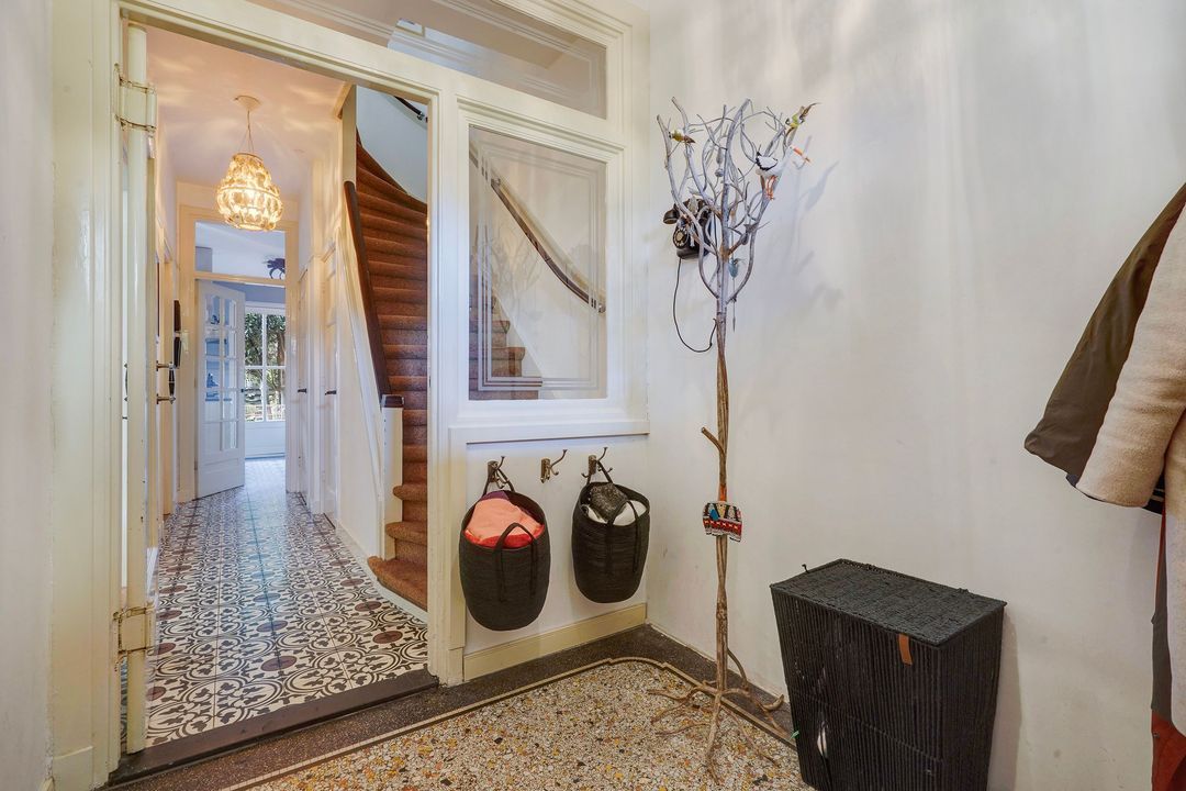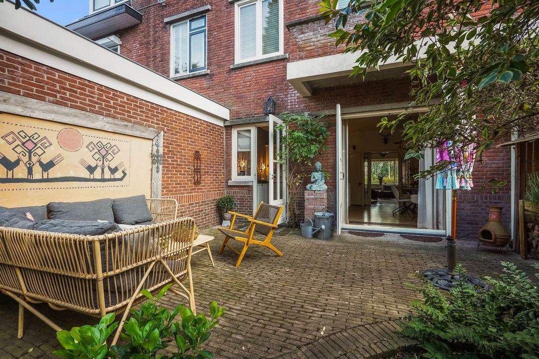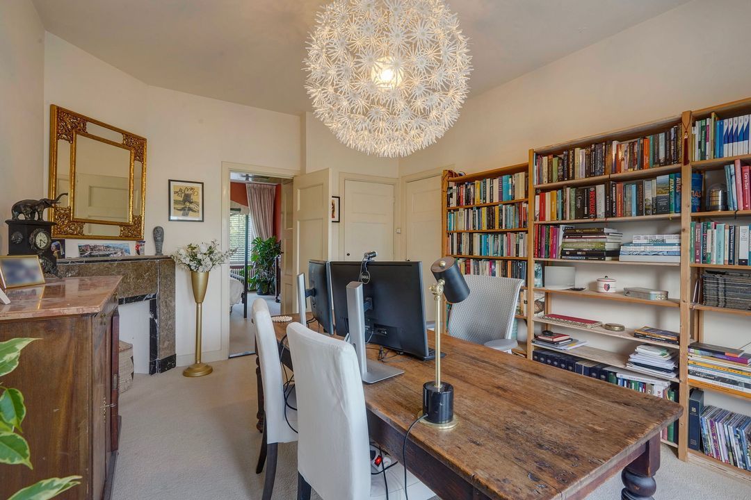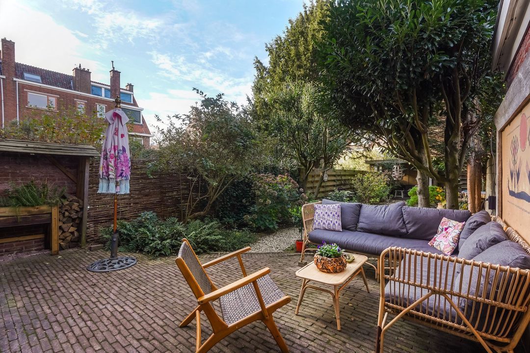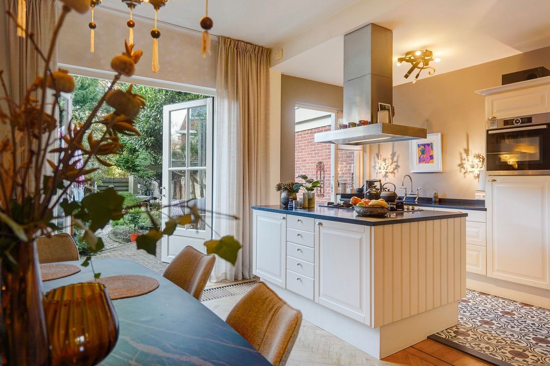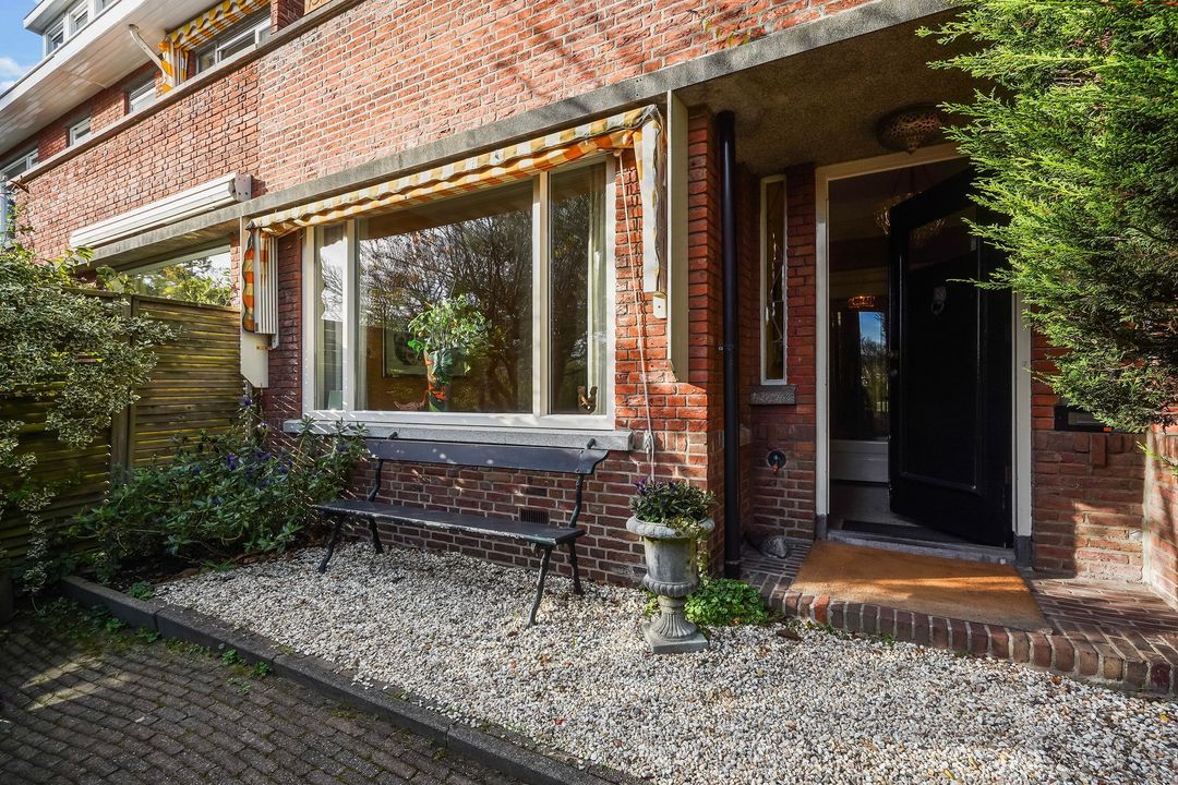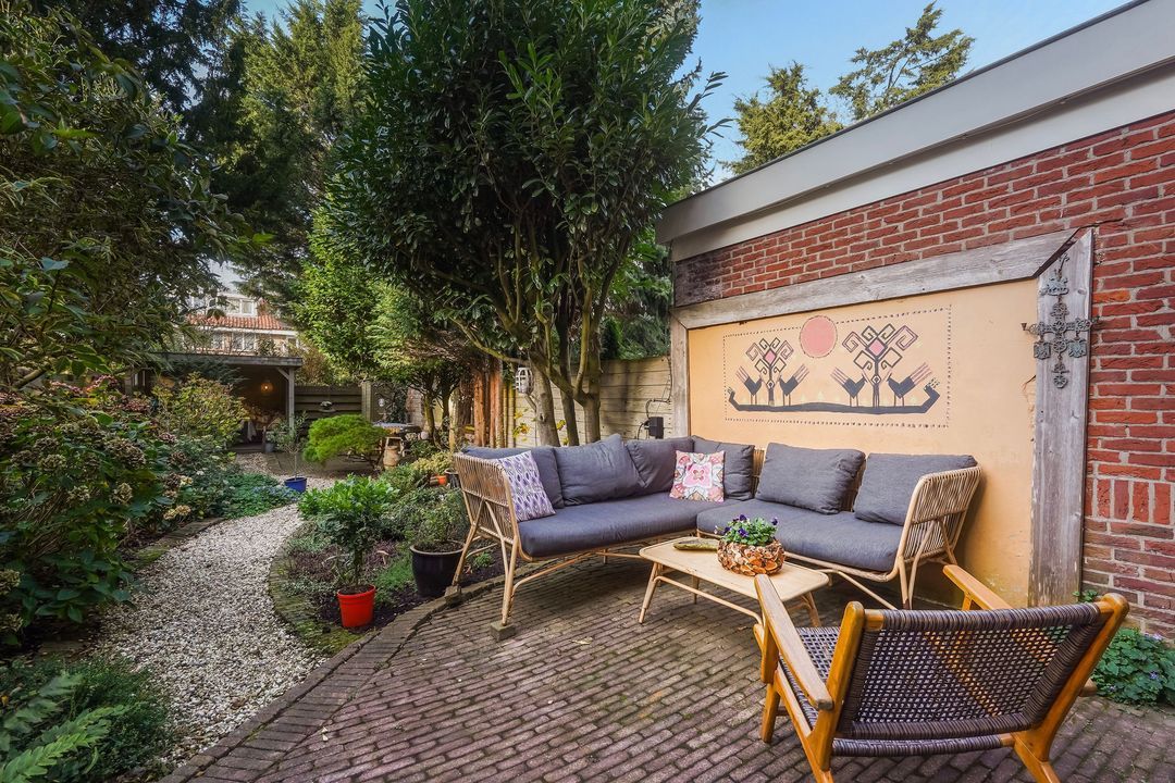 Voortuin met verzonken fietsenberging en portaal, entree met de originele voordeur, vestibule met fraaie granieten vloer, voorzien van ornament en tochtseparatie, gang met een fraaie tegelvloer doorgelegd in de keuken, toegang naar een ruime kelder opgedeeld in 2 ruimtes, sfeervolle kamer ensuite voorzien van schuifseparatie met glas in lood en 3 vaste kasten, 2 zwart marmeren schouwen met gas- en hout openhaard, visgraatparketvloer en open klassieke keuken met een kookeiland voorzien van 5 pits gasfornuis en afzuigkap, verder een recht keukenblok met combi magnetron, koel/vrieskast, verzonken spoelbak en vaatwasser. Beide keukenblokken zijn voorzien van een zwart natuurstenen aanrechtblad. Riante achtertuin van ruim 20 meter diep, voorzien van 2 terrassen en een veranda.