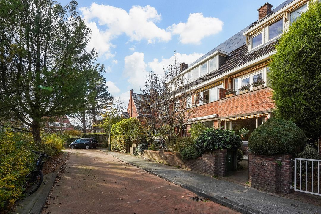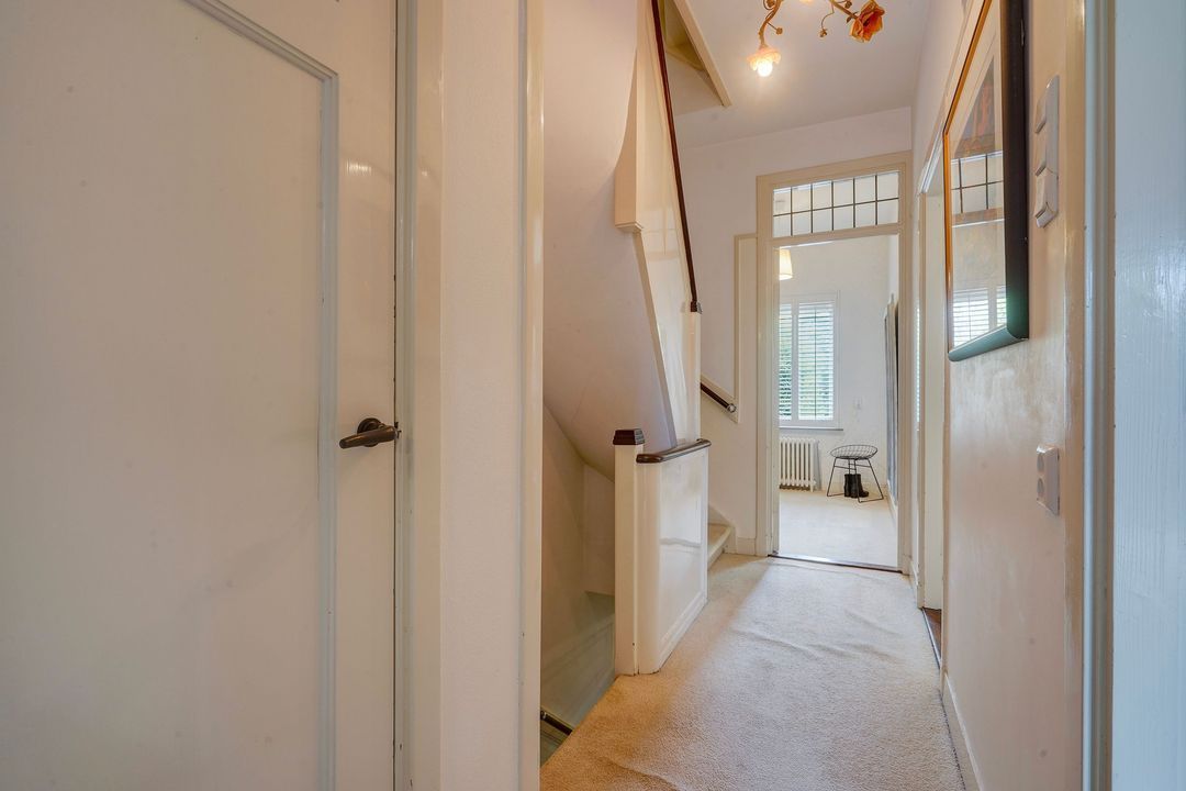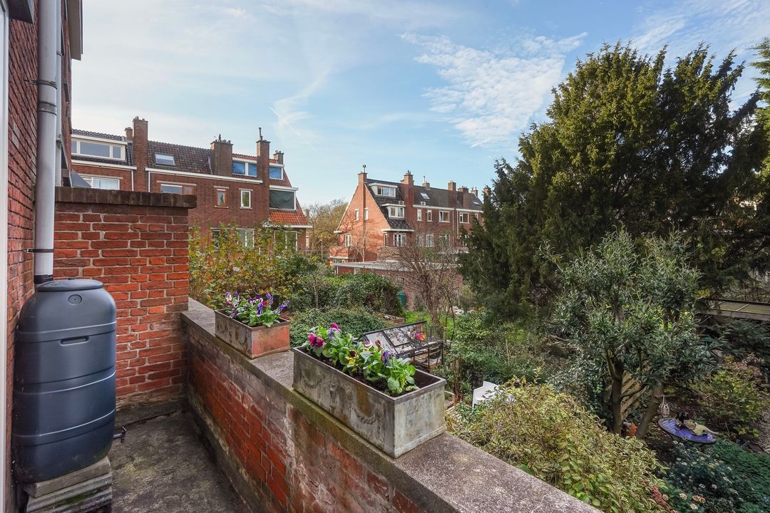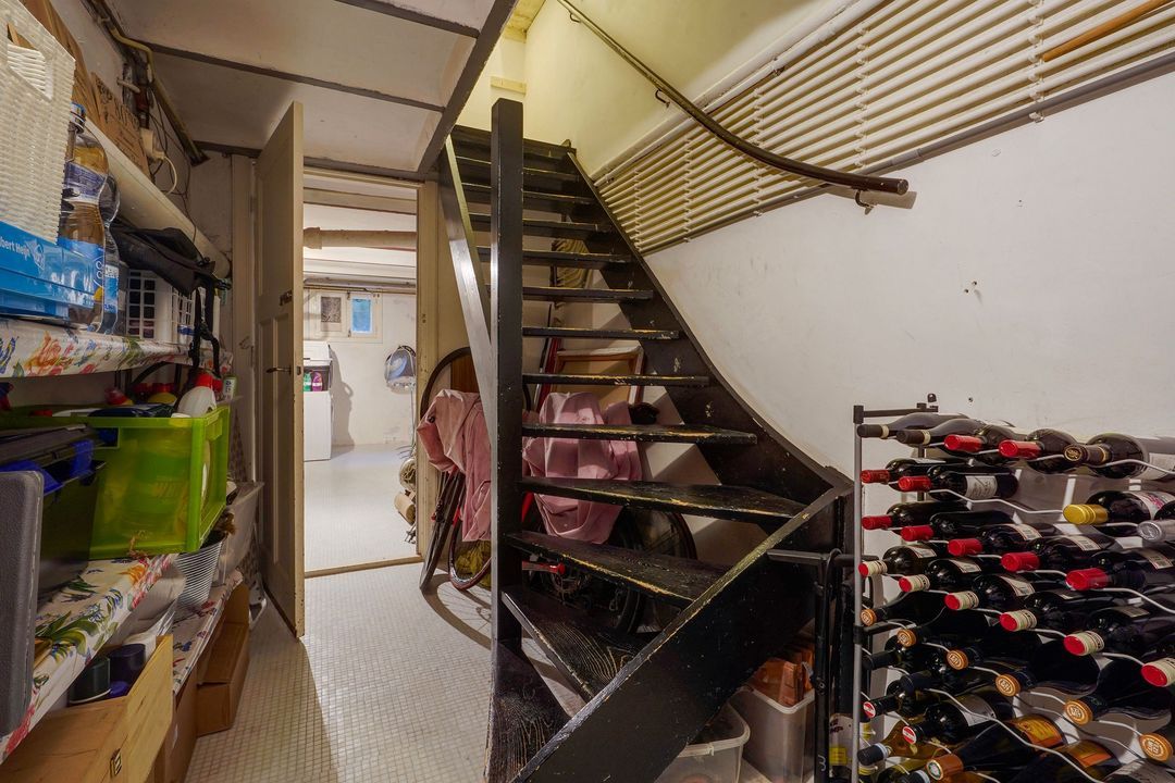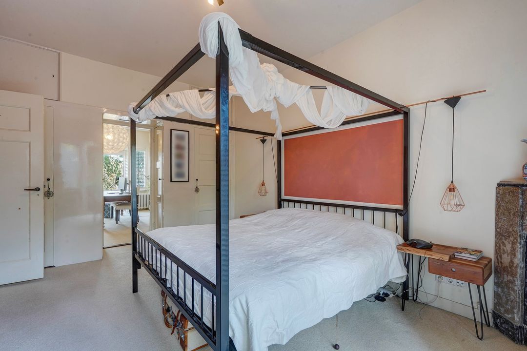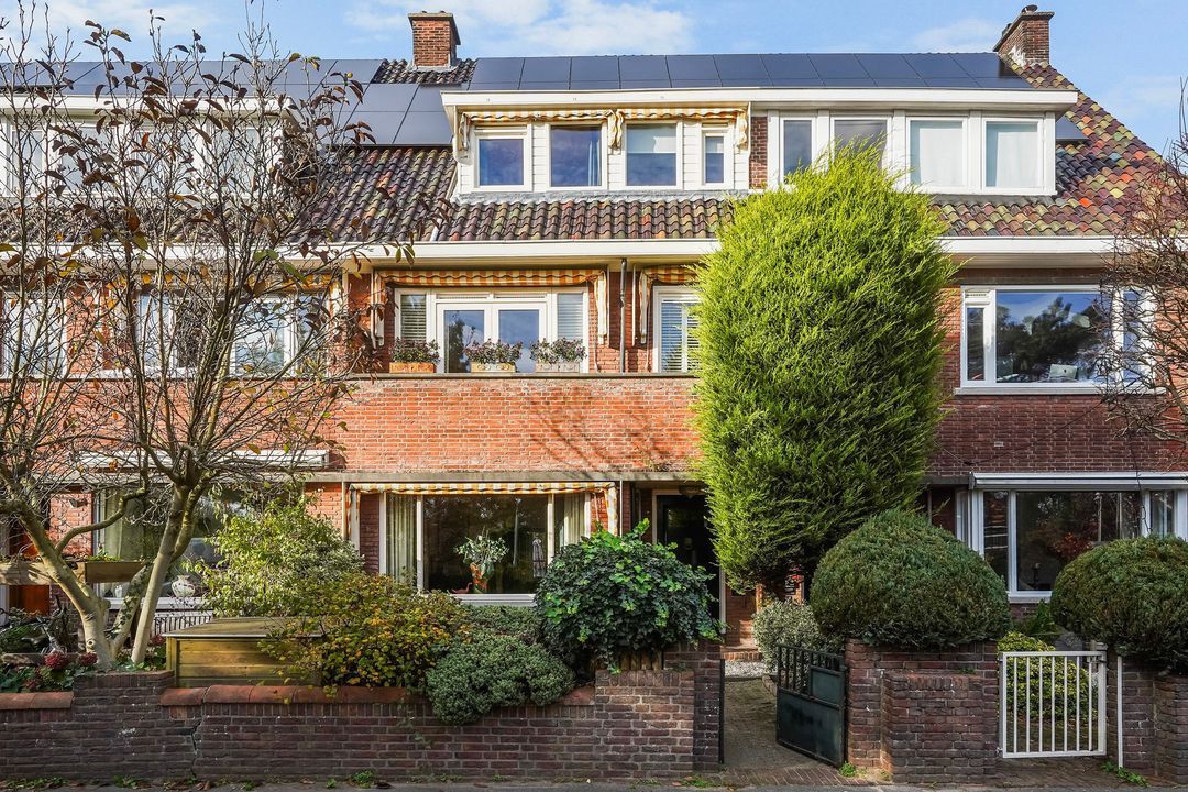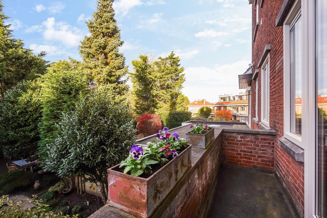 Voortuin met verzonken fietsenberging en portaal, entree met de originele voordeur, vestibule met fraaie granieten vloer, voorzien van ornament en tochtseparatie, gang met een fraaie tegelvloer doorgelegd in de keuken, toegang naar een ruime kelder opgedeeld in 2 ruimtes, sfeervolle kamer ensuite voorzien van schuifseparatie met glas in lood en 3 vaste kasten, 2 zwart marmeren schouwen met gas- en hout openhaard, visgraatparketvloer en open klassieke keuken met een kookeiland voorzien van 5 pits gasfornuis en afzuigkap, verder een recht keukenblok met combi magnetron, koel/vrieskast, verzonken spoelbak en vaatwasser. Beide keukenblokken zijn voorzien van een zwart natuurstenen aanrechtblad. Riante achtertuin van ruim 20 meter diep, voorzien van 2 terrassen en een veranda.