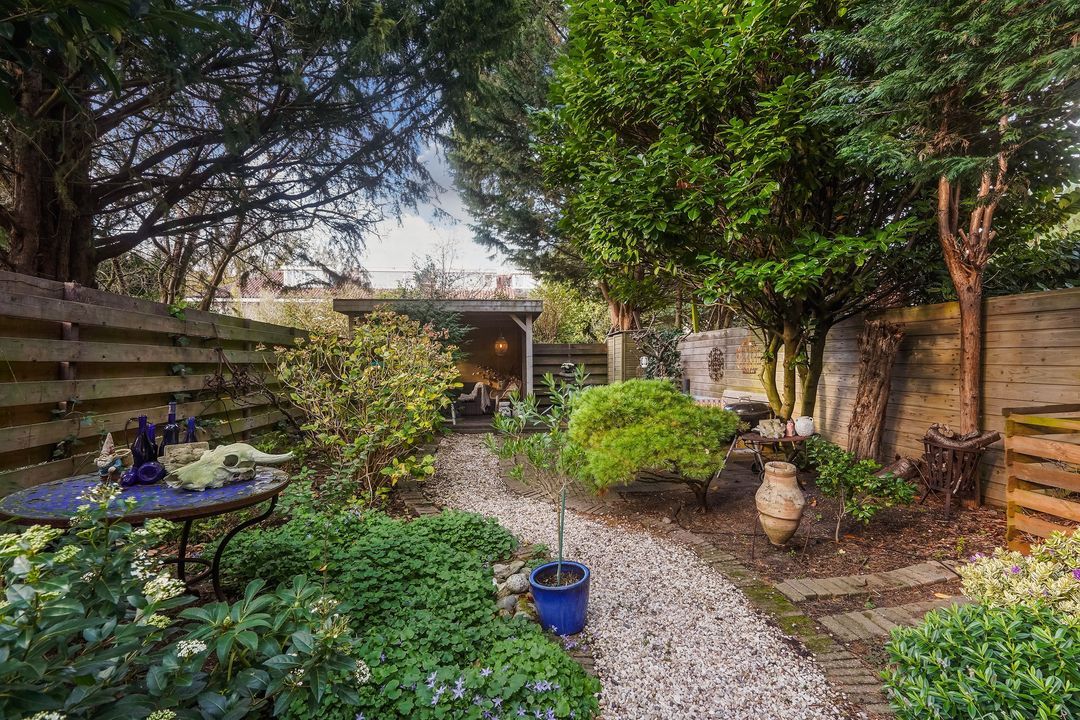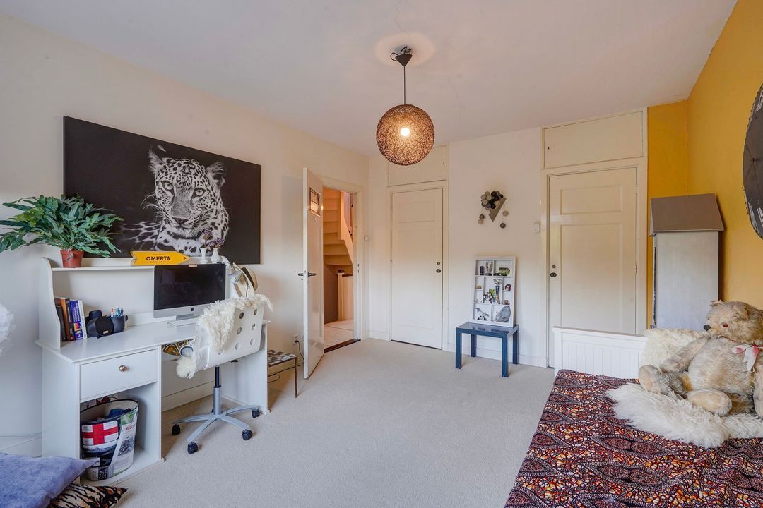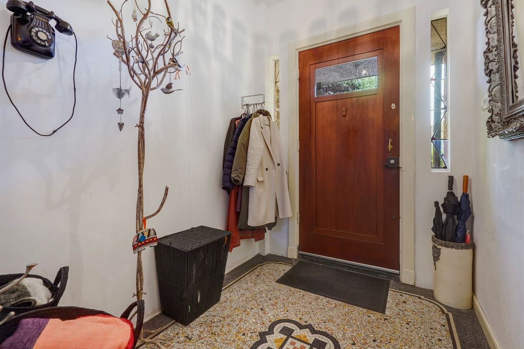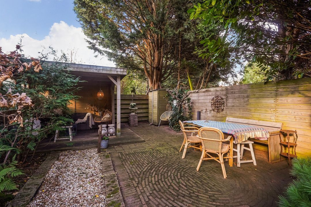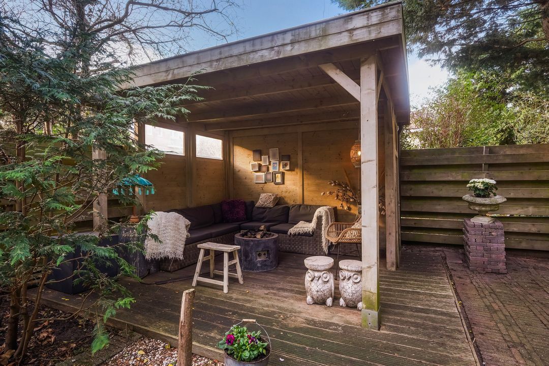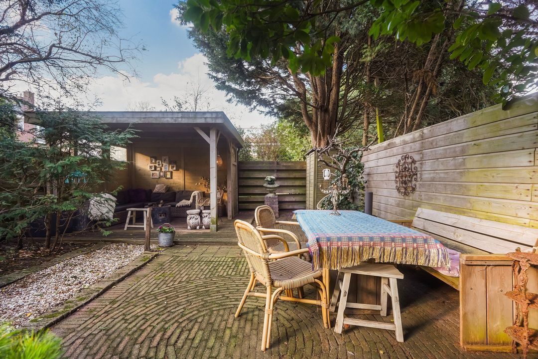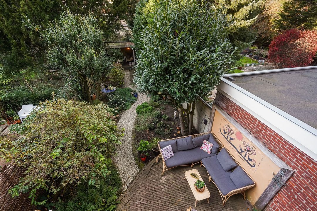 Voortuin met verzonken fietsenberging en portaal, entree met de originele voordeur, vestibule met fraaie granieten vloer, voorzien van ornament en tochtseparatie, gang met een fraaie tegelvloer doorgelegd in de keuken, toegang naar een ruime kelder opgedeeld in 2 ruimtes, sfeervolle kamer ensuite voorzien van schuifseparatie met glas in lood en 3 vaste kasten, 2 zwart marmeren schouwen met gas- en hout openhaard, visgraatparketvloer en open klassieke keuken met een kookeiland voorzien van 5 pits gasfornuis en afzuigkap, verder een recht keukenblok met combi magnetron, koel/vrieskast, verzonken spoelbak en vaatwasser. Beide keukenblokken zijn voorzien van een zwart natuurstenen aanrechtblad. Riante achtertuin van ruim 20 meter diep, voorzien van 2 terrassen en een veranda.