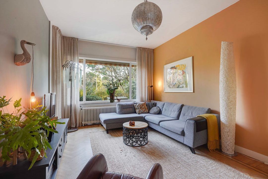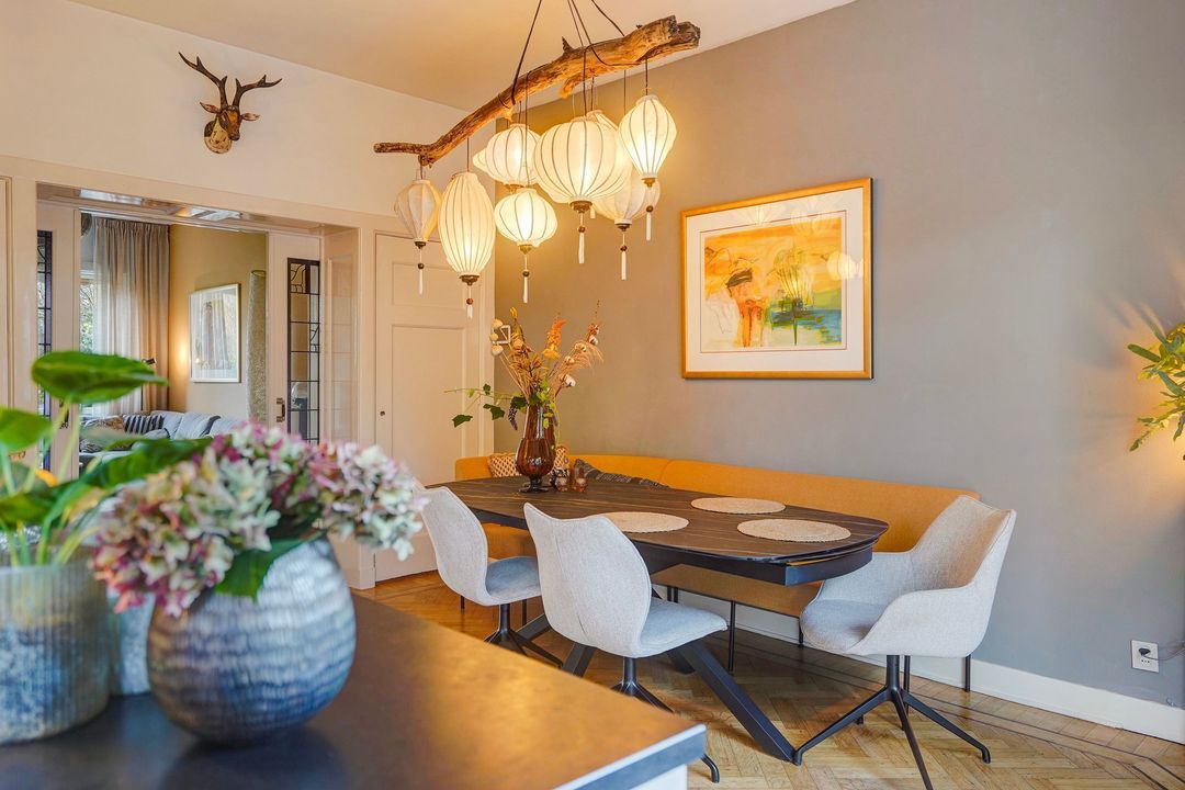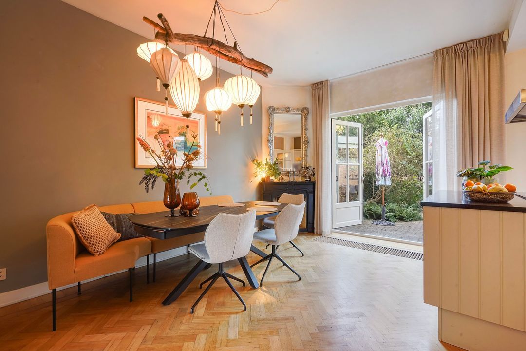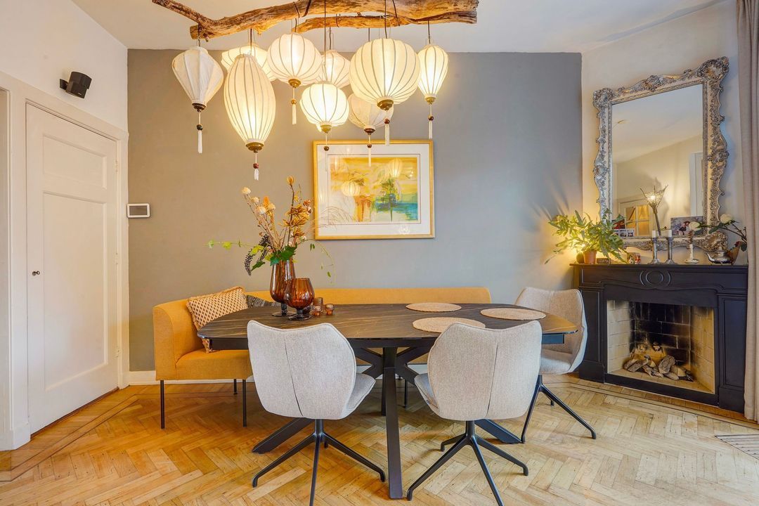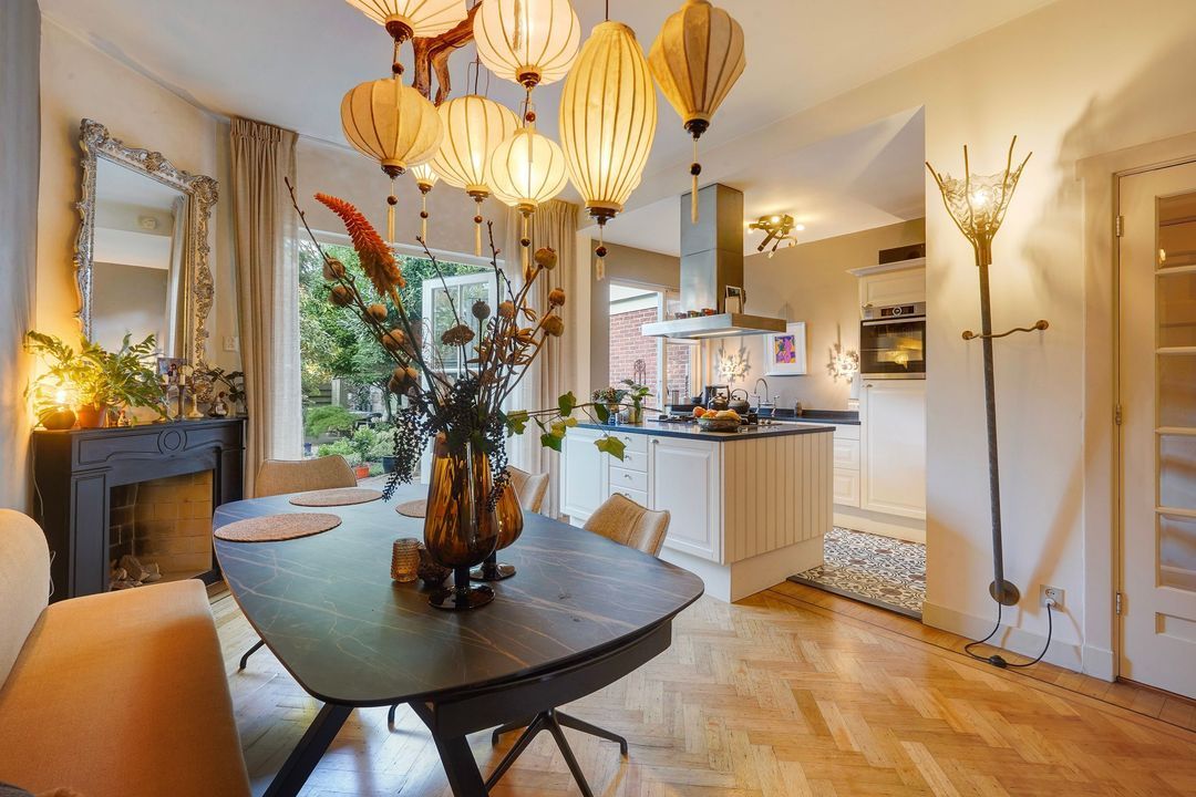 Front garden with a bicycle shed and porch, entrance with the original front door, vestibule with a beautiful granite floor, ornamentation and a draft barrier, a hallway with a beautiful tiled floor extending into the kitchen, access to a spacious basement divided into 2 rooms, a charming ensuite room with sliding doors, stained glass, and 3 built-in cupboards, 2 black marble fireplaces (gas and wood-burning), herringbone parquet flooring, and an open-plan classic kitchen with a cooking island equipped with a 5-burner gas stove and extractor hood. A straight kitchen unit with a combination microwave, refrigerator/freezer, recessed sink and dishwasher. Both kitchen units have black natural stone countertop. A spacious backyard of more than 20 meters deep features 2 patios and a veranda.