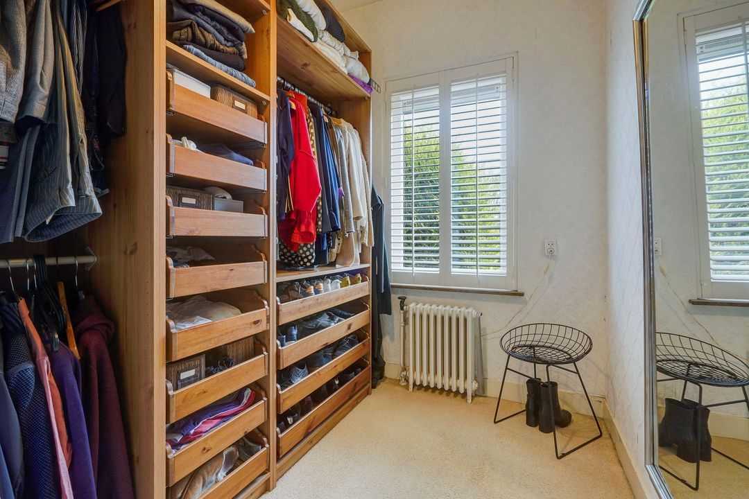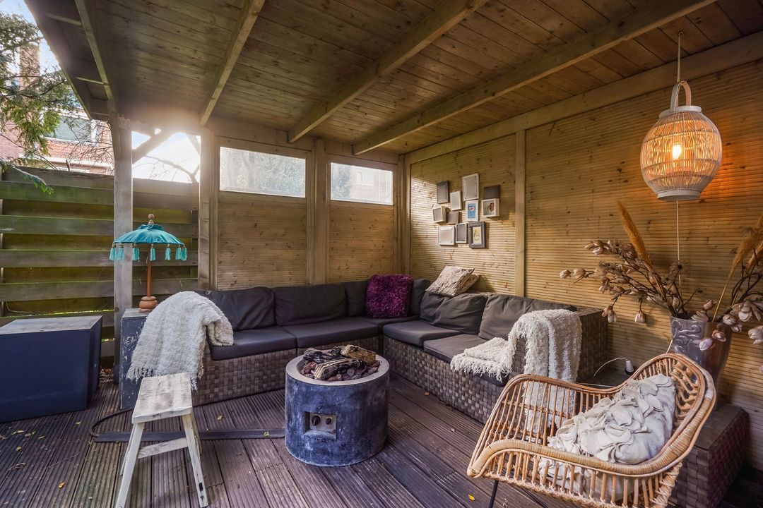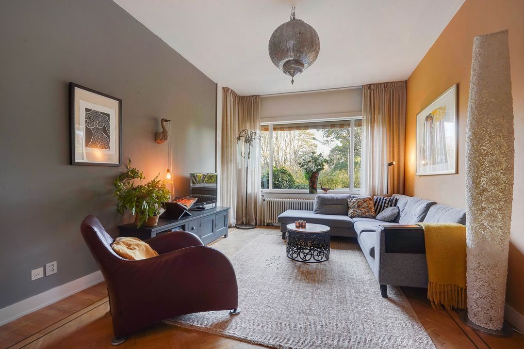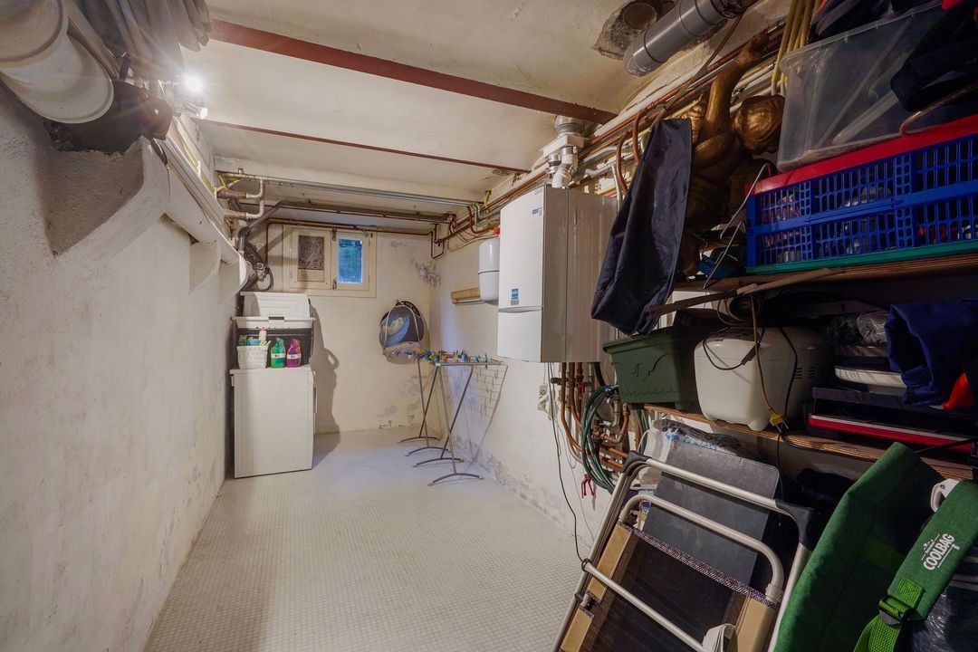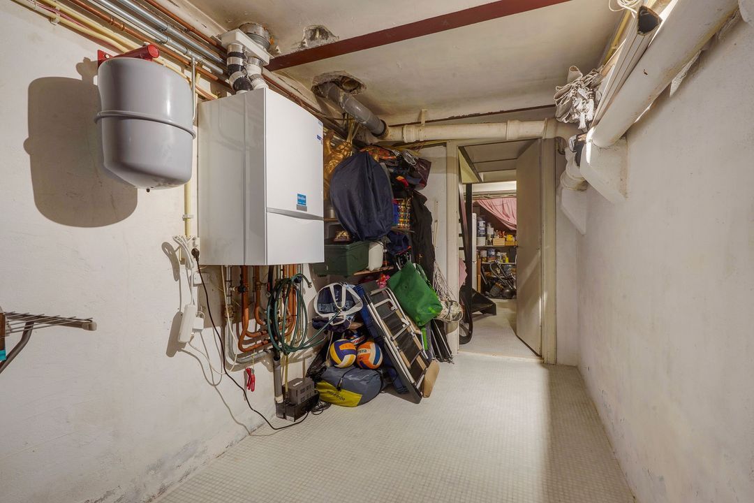 Front garden with a bicycle shed and porch, entrance with the original front door, vestibule with a beautiful granite floor, ornamentation and a draft barrier, a hallway with a beautiful tiled floor extending into the kitchen, access to a spacious basement divided into 2 rooms, a charming ensuite room with sliding doors, stained glass, and 3 built-in cupboards, 2 black marble fireplaces (gas and wood-burning), herringbone parquet flooring, and an open-plan classic kitchen with a cooking island equipped with a 5-burner gas stove and extractor hood. A straight kitchen unit with a combination microwave, refrigerator/freezer, recessed sink and dishwasher. Both kitchen units have black natural stone countertop. A spacious backyard of more than 20 meters deep features 2 patios and a veranda.