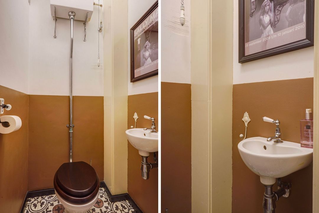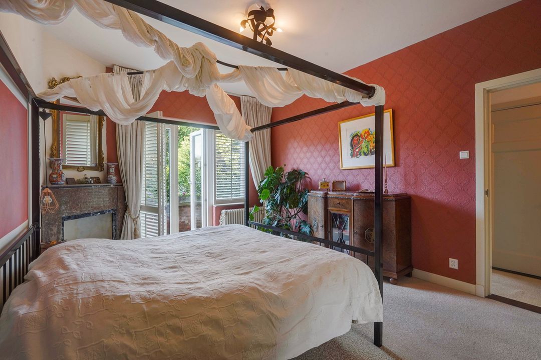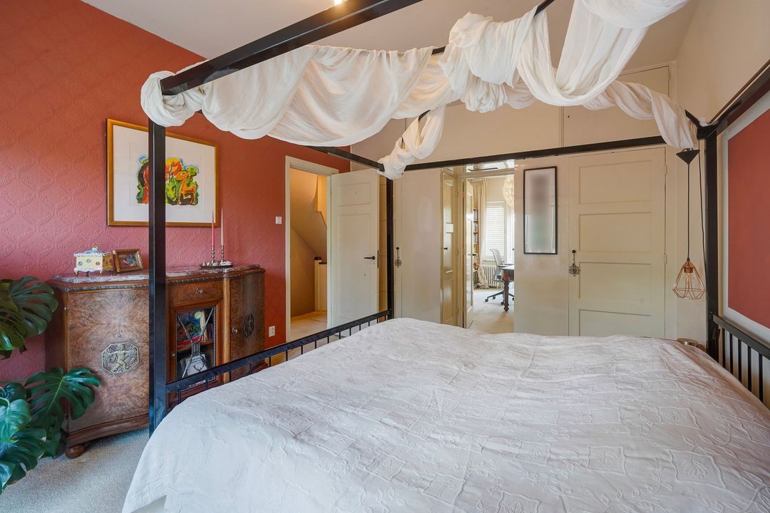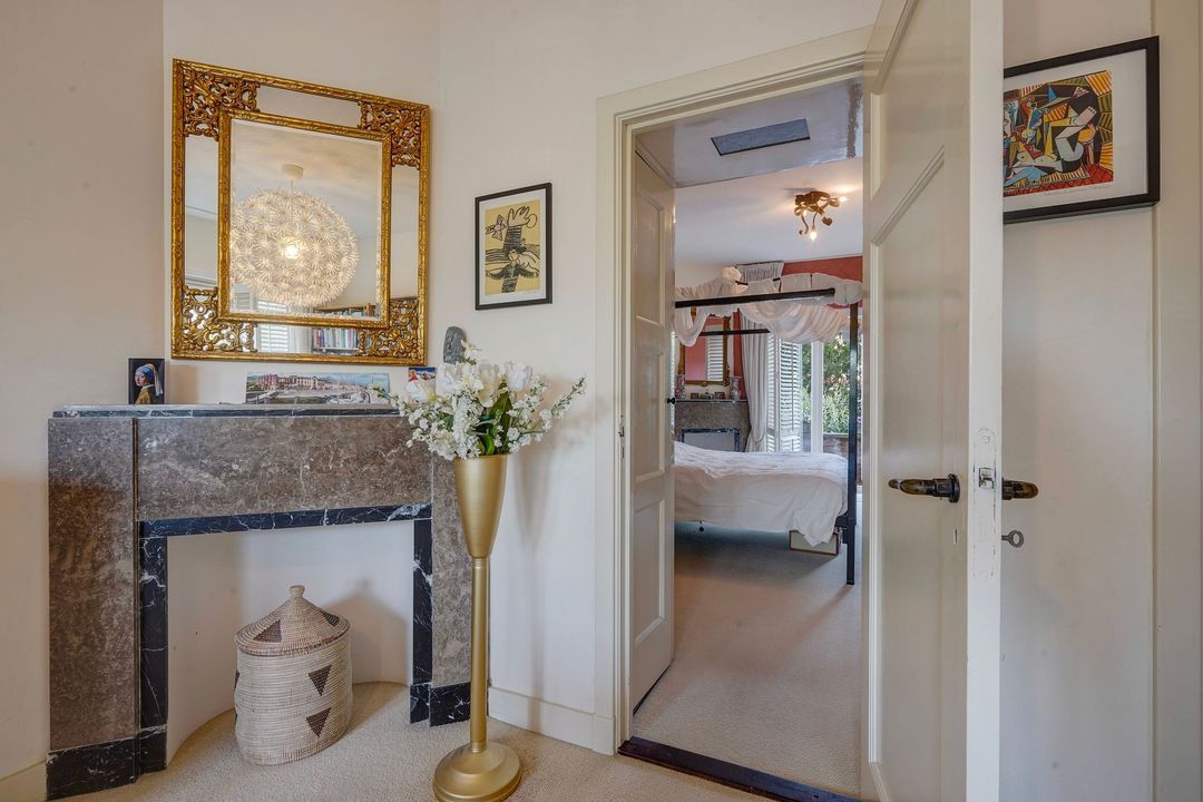Overloop, toilet met de originele wandtegels en fontein, badkamer met een fraaie tegelvloer en inloop (stort)douche en 2 wastafels, kamer ensuite met 5 vaste kasten, beide kamers voorzien van een marmeren schouw en toegang naar balkons, voorzijkamer.