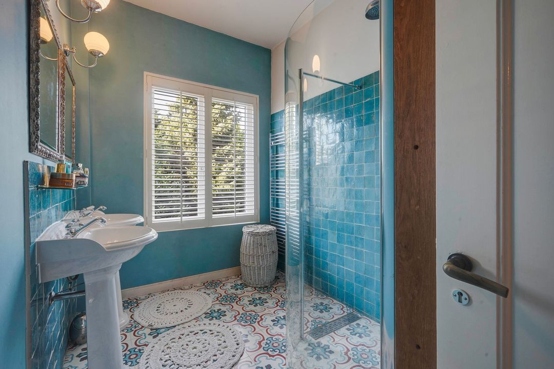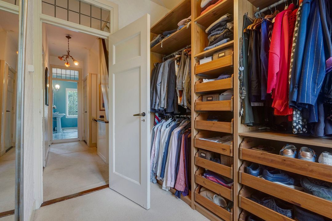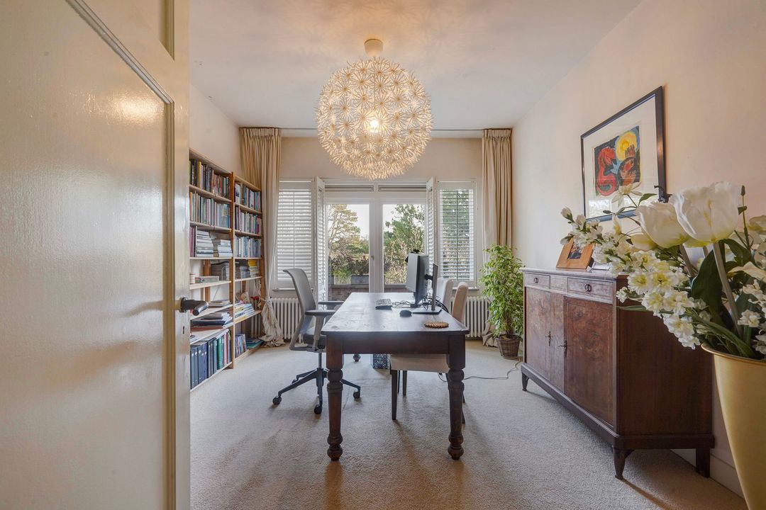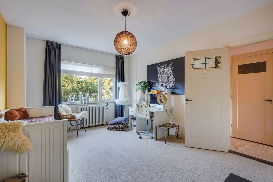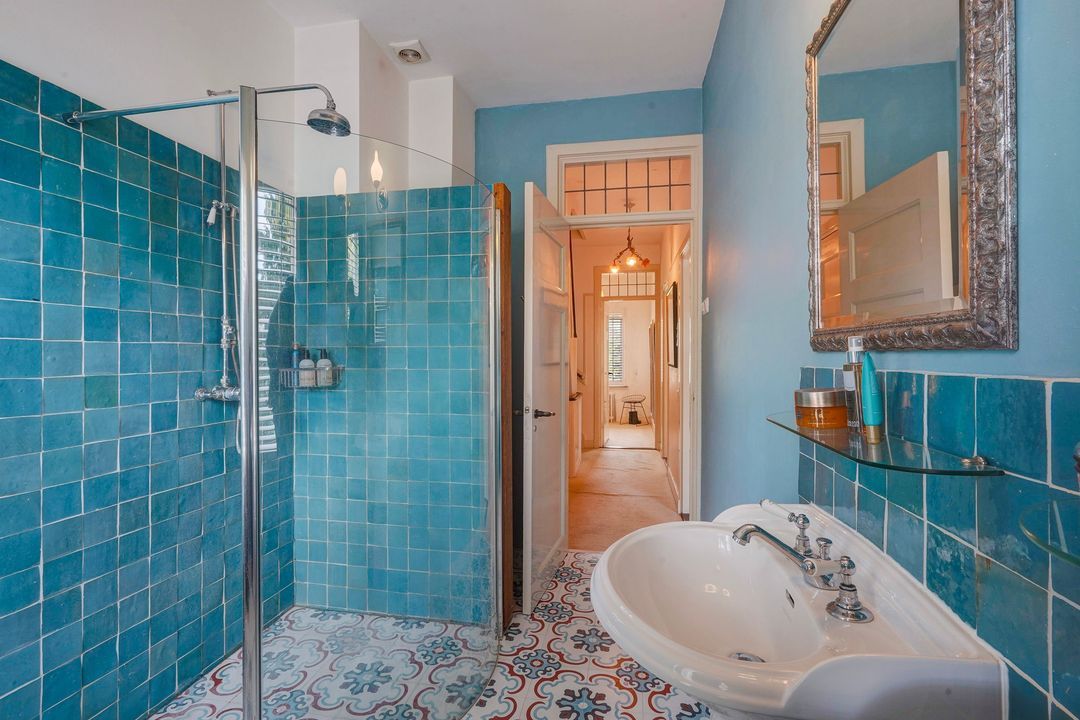 Overloop, toilet met de originele wandtegels en fontein, badkamer met een fraaie tegelvloer en inloop (stort)douche en 2 wastafels, kamer ensuite met 5 vaste kasten, beide kamers voorzien van een marmeren schouw en toegang naar balkons, voorzijkamer.