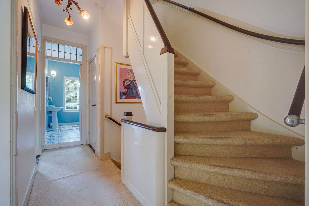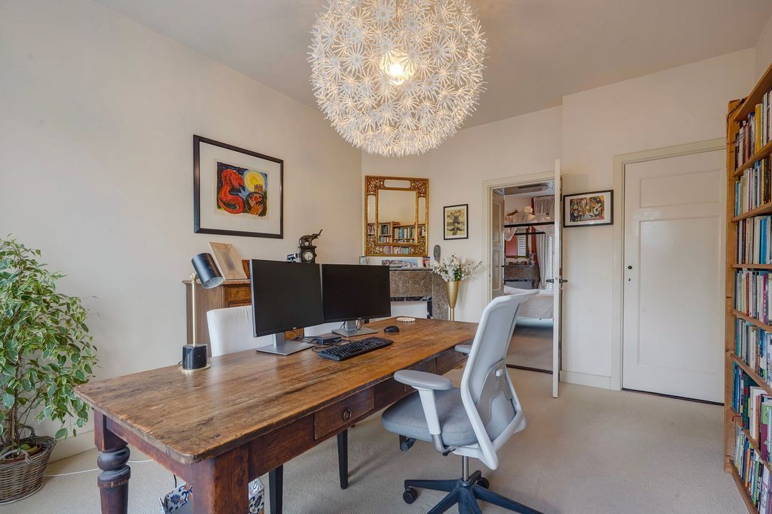 Landing, toilet with original wall tiles and a hand basin, bathroom with a beautiful tiled floor and a walk-in shower and two sinks, ensuite bedroom with five built-in wardrobes, both rooms featuring a marble fireplace and access to a balcony, front side room.