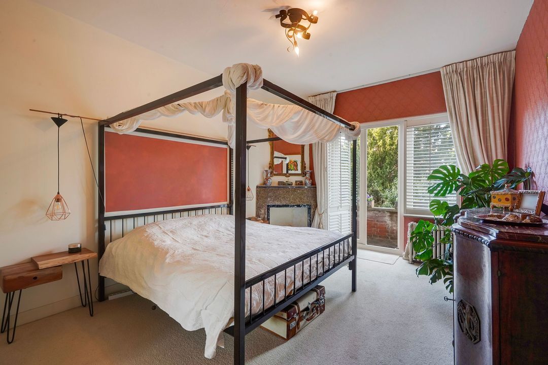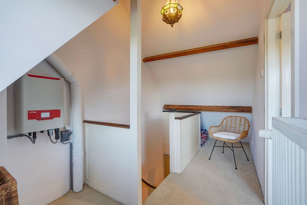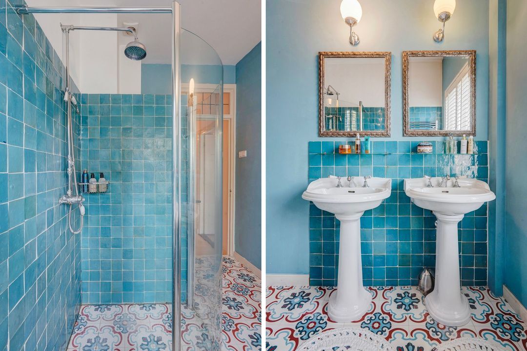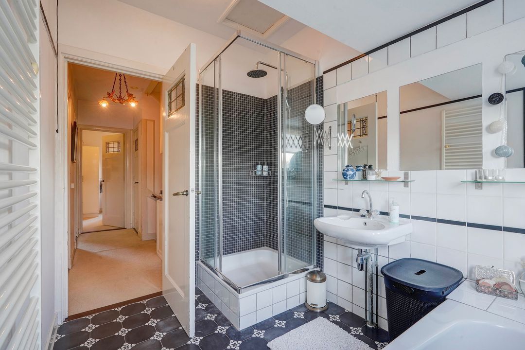 Landing, toilet with original wall tiles and a hand basin, rear side room, spacious rear bedroom with two built-in wardrobes, front bedroom with a dormer window and two built-in wardrobes, second bathroom tiled in black and white with a bathtub, sink and shower.