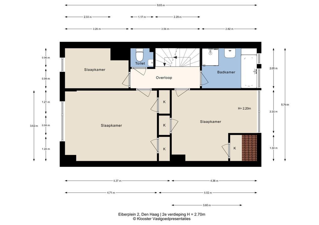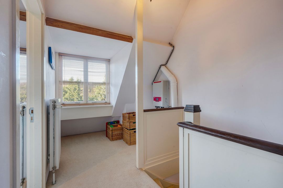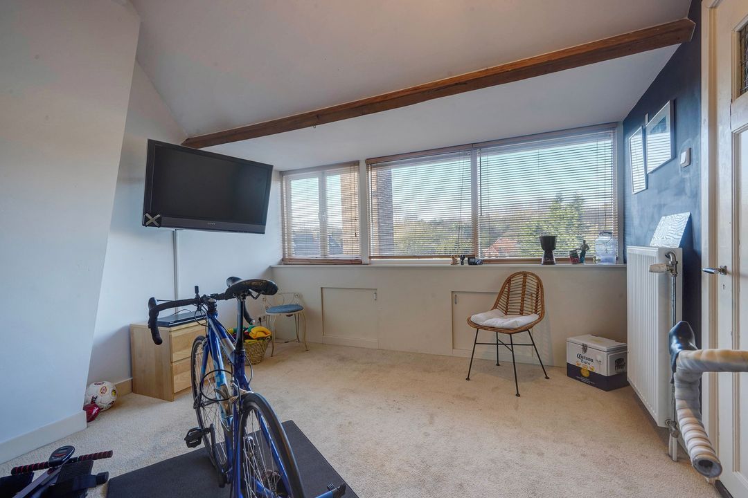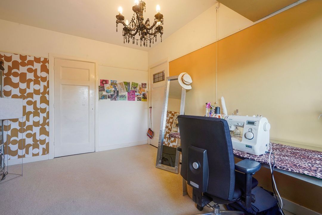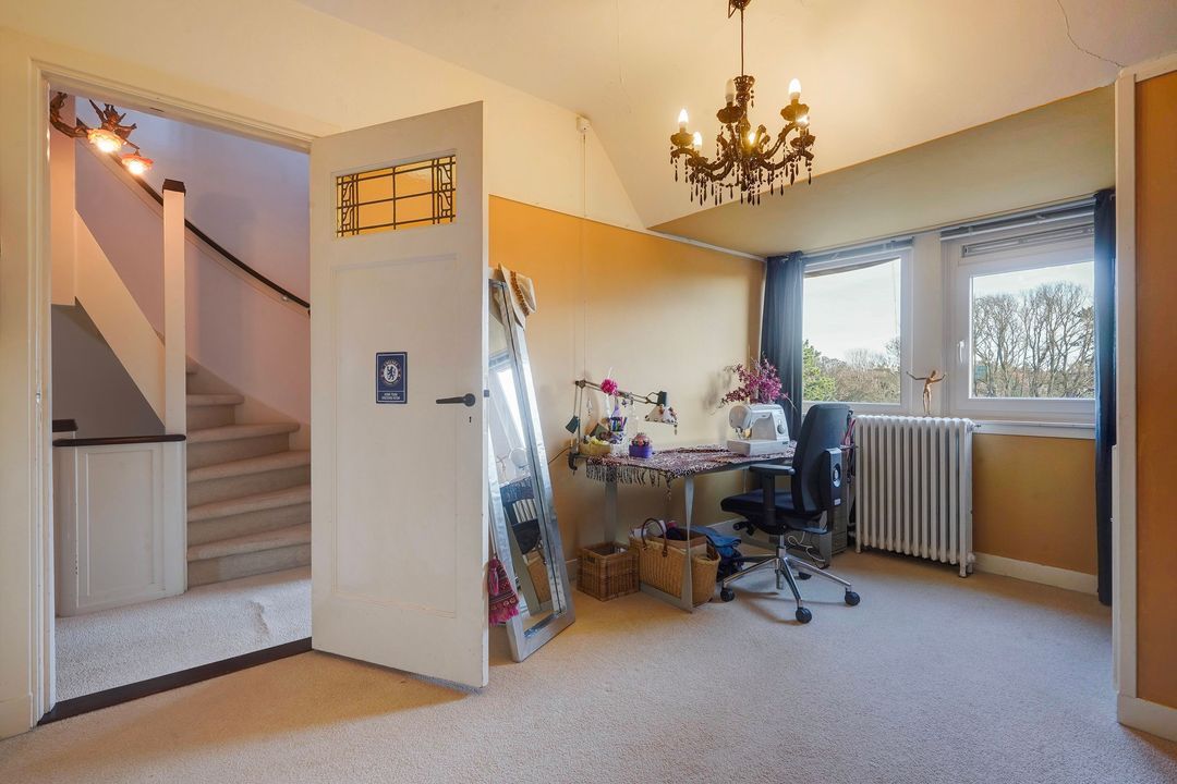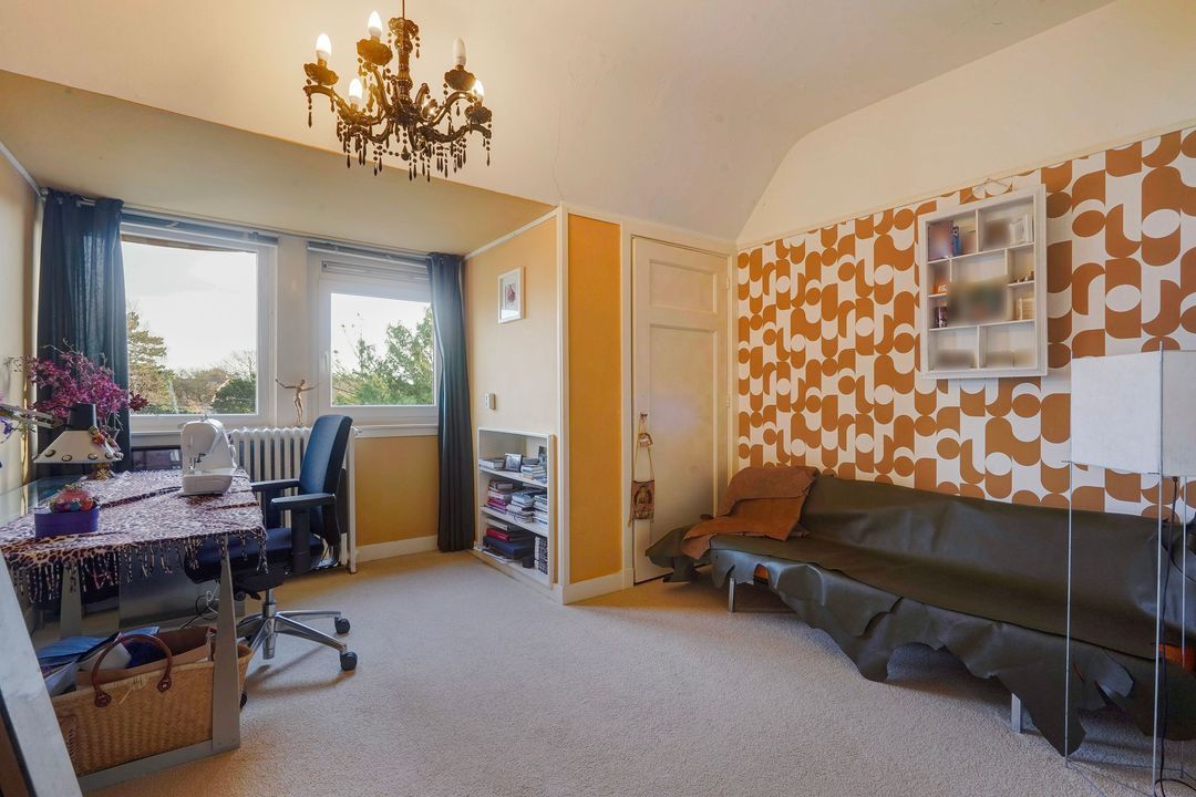 Overloop, slaapkamer met een nokhoogte van 2.15 meter. Het achterdakschild beslaat vrijwel de gehele breedte en is voorzien van een dakkapel en voorzien van knieschotten.