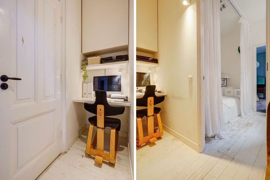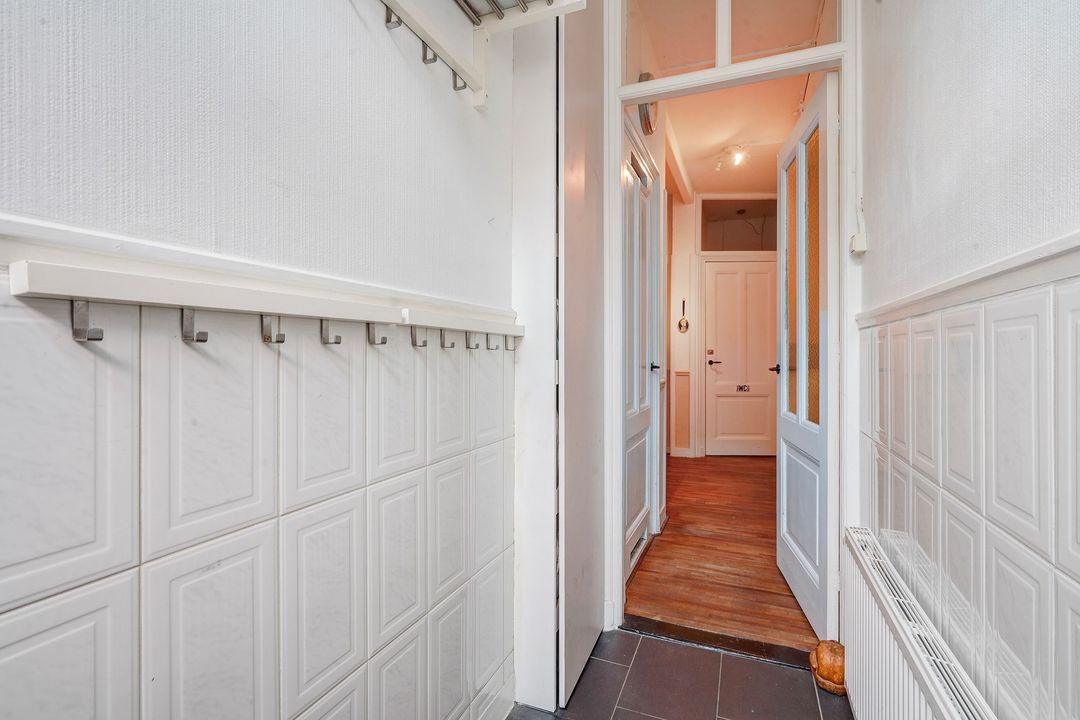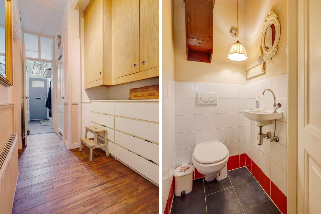 Via de eigen entree stapt u binnen in de vestibule met schoenenkast en tochtdeur. De gang is voorzien van een op maat gemaakte kastenwand en biedt toegang tot een apart toilet met fontein en een praktische bergkast onder de trap met wasmachine-aansluiting.