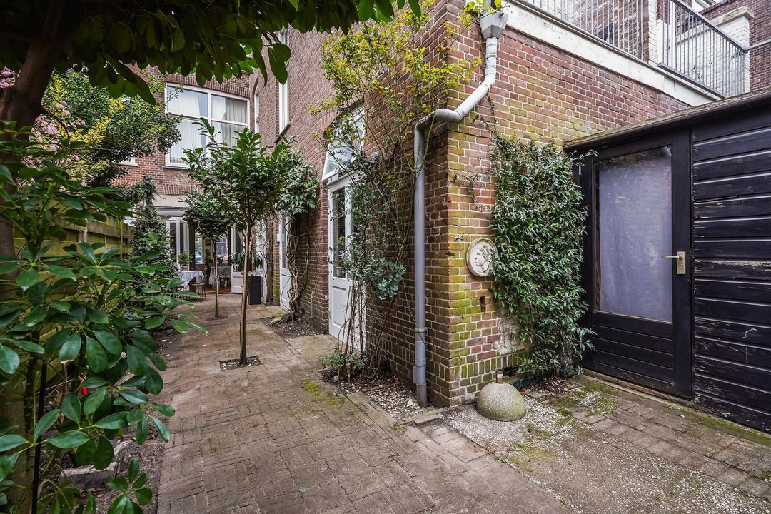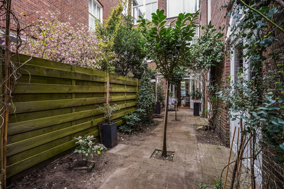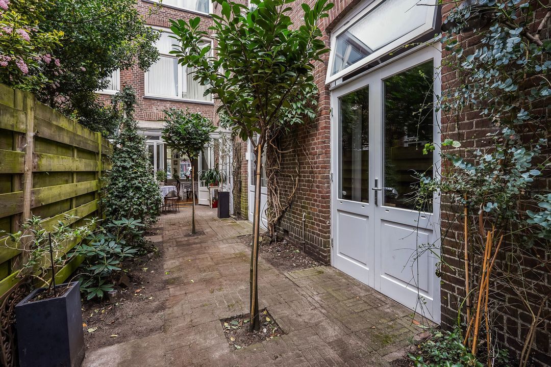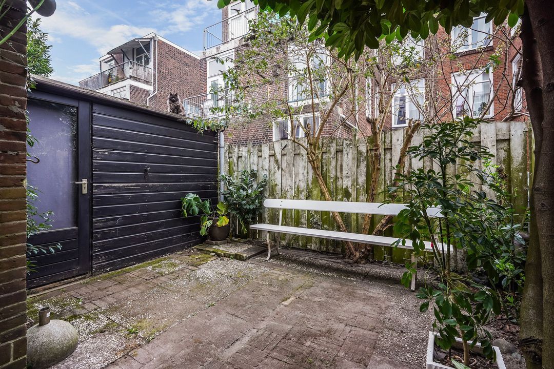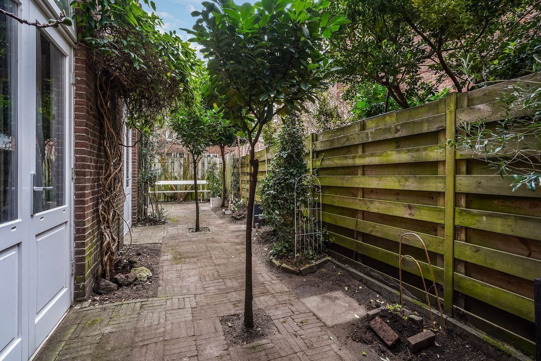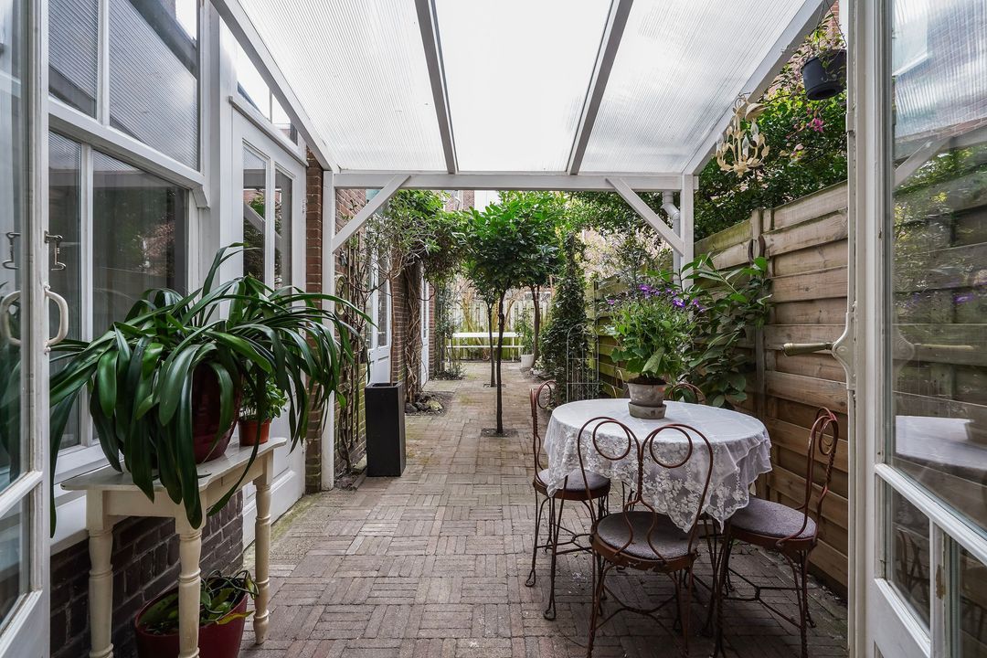 Via openslaande deuren bereikt u de ruime L-vormige achtertuin (noordoosten), voorzien van een overkapping en een aangebouwde houten berging met elektra.
