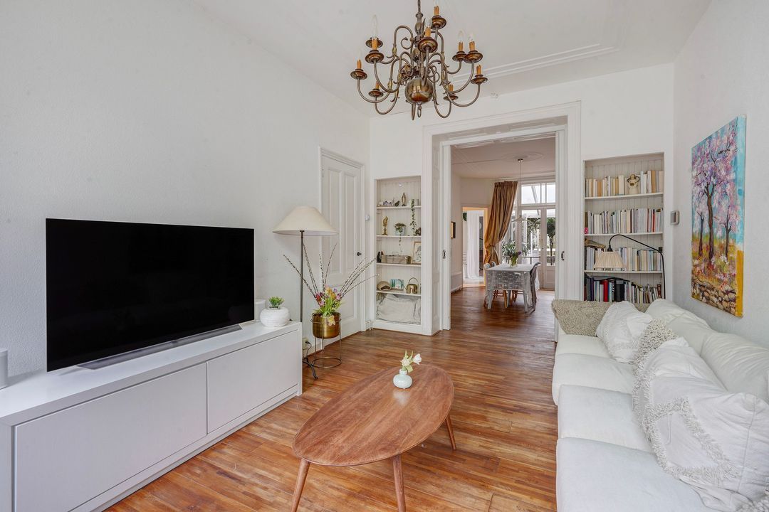 De woonkamer en suite is voorzien van teak houten vloerdelen, glas-in-lood bovenlichten en fraaie schuifseparatie met glas in looddeuren en 4 vaste kasten.