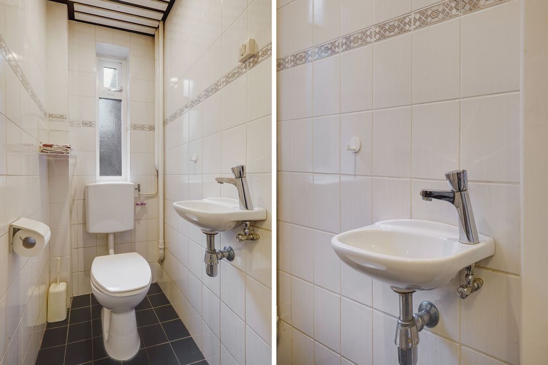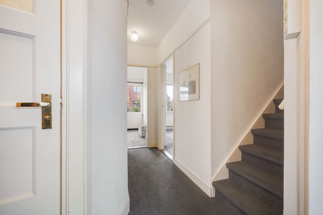 Entree aan de voorzijde, vestibule met originele wandtegels, granito vloer, garderobe en tochtdeur voorzien van glas in lood, gang, verdiepte trappenkast, toilet met duoblok en fontein.