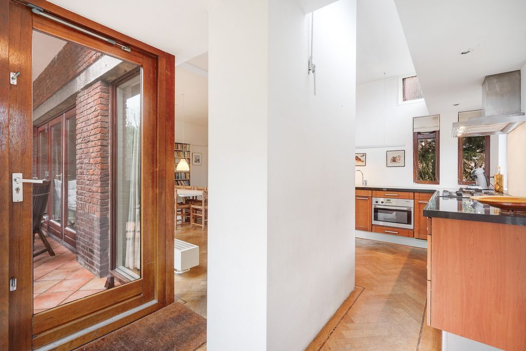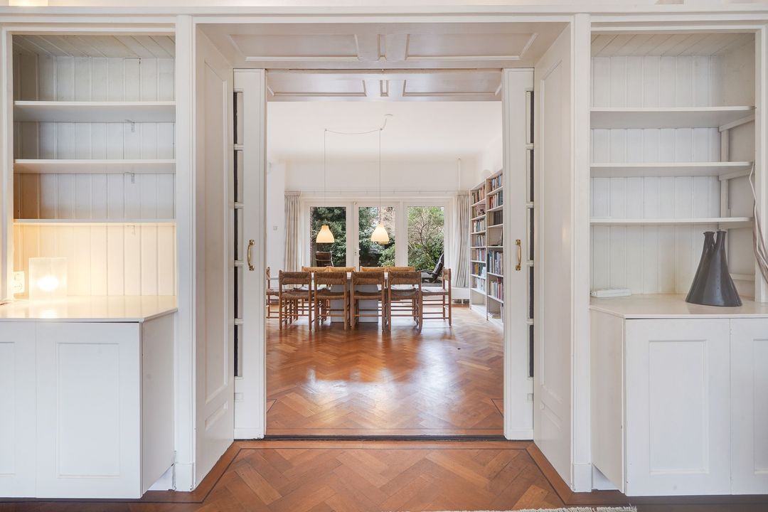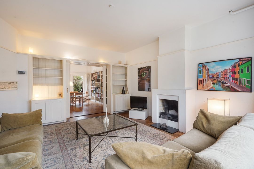 Charming en-suite room with sliding doors and 4 built-in wardrobes, herringbone parquet flooring, a wood-burning fireplace and an open, extended kitchen with herringbone parquet flooring and a L-shaped kitchen unit featuring a black natural stone countertop, dishwasher, oven, 5-burner gas stove, and access to the southwest-facing back garden with a spacious garage with electricity and storage.