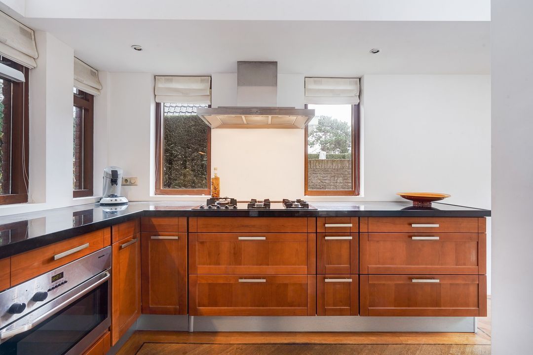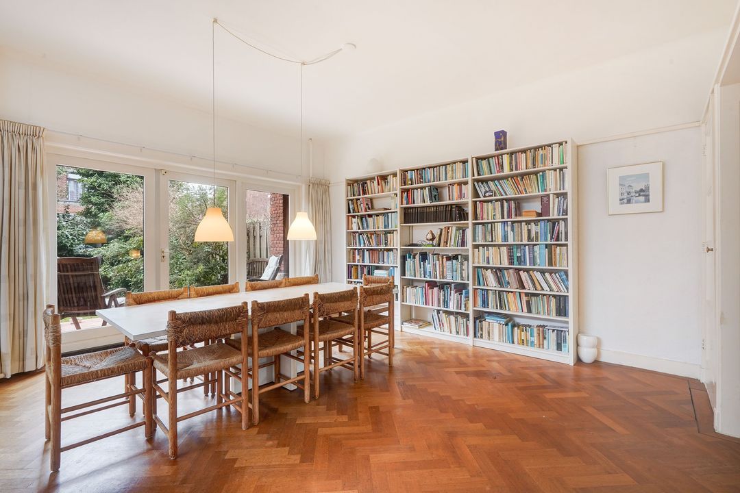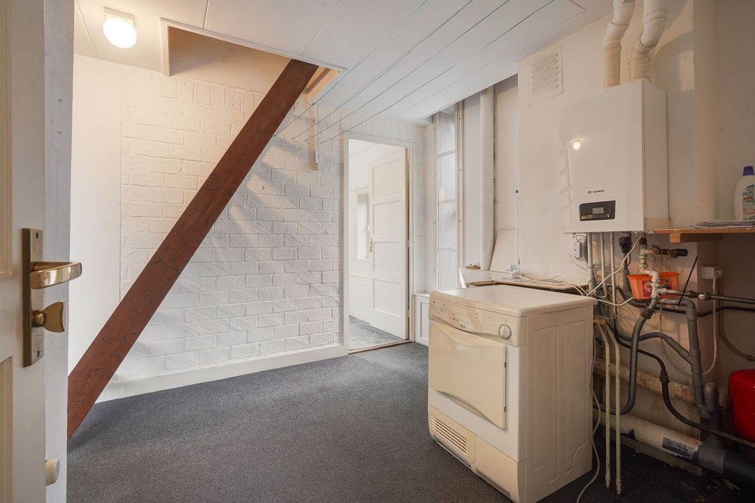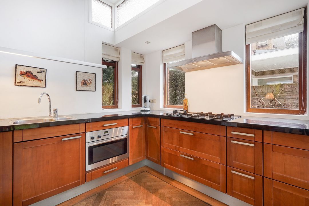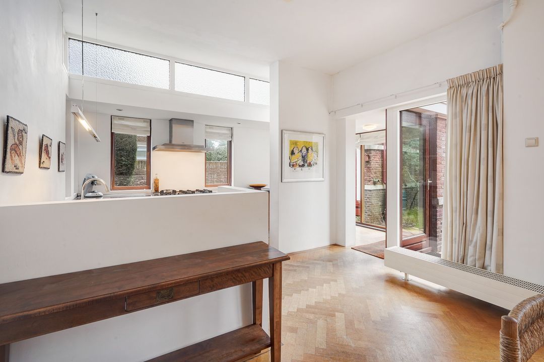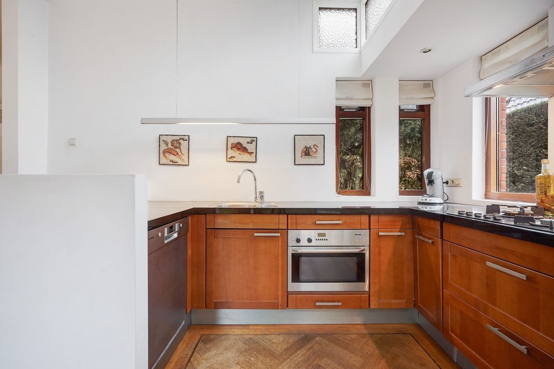 Sfeervolle kamer en suite met schuifseparatie en 4 vaste kasten, visgraatparketvloer, hout open haard en open uitgebouwde keuken tevens voorzien van een visgraatparketvloer en L-vormig keukenblok voorzien van zwart natuurstenen aanrechtblad, vaatwasser, oven, 5-pits gasfornuis en toegang naar de achtertuin gelegen op het zuidwesten voorzien van een ruime garage met elektra en berging.