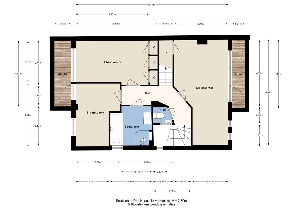 Overloop, toilet met duoblok en fontein, badkamer voorzien van ligbad, douchecabine en wastafel, voorslaapkamer gelegen over de gehele breedte van de woning met een vaste kast en toegang naar een balkon met fantastisch uitzicht naar het Eiberplein en de Fuutlaan.