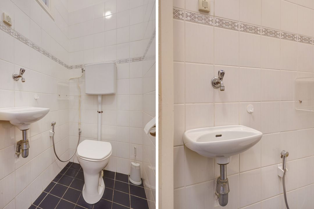 Landing, toilet with dual-block system and hand basin, bathroom with bathtub, shower, and wash basin, front bedroom spanning the entire width of the house with a built-in wardrobe and access to a balcony with fantastic views of Eiberplein and Fuutlaan.