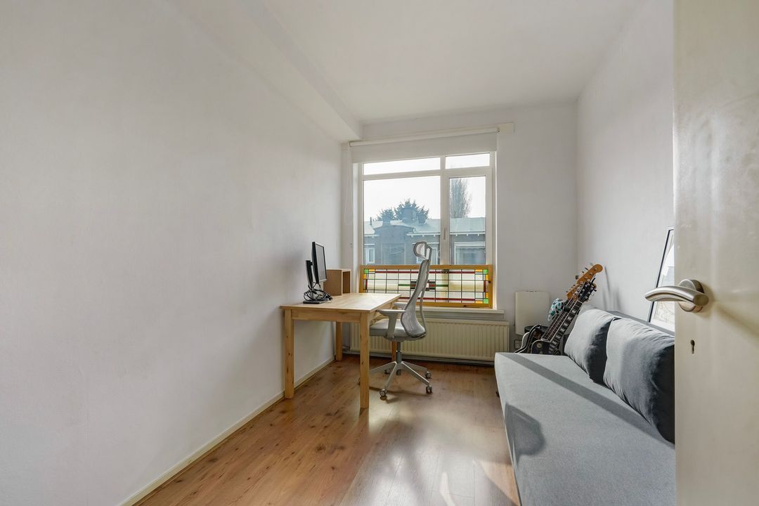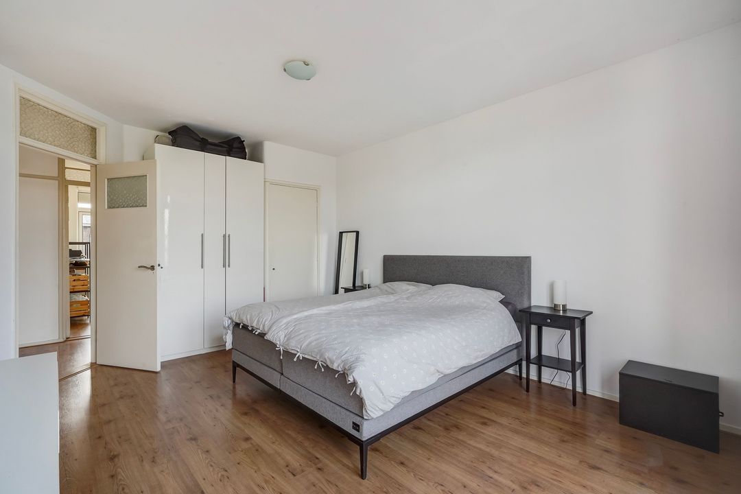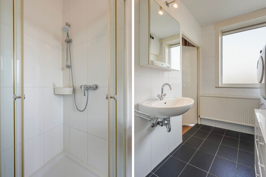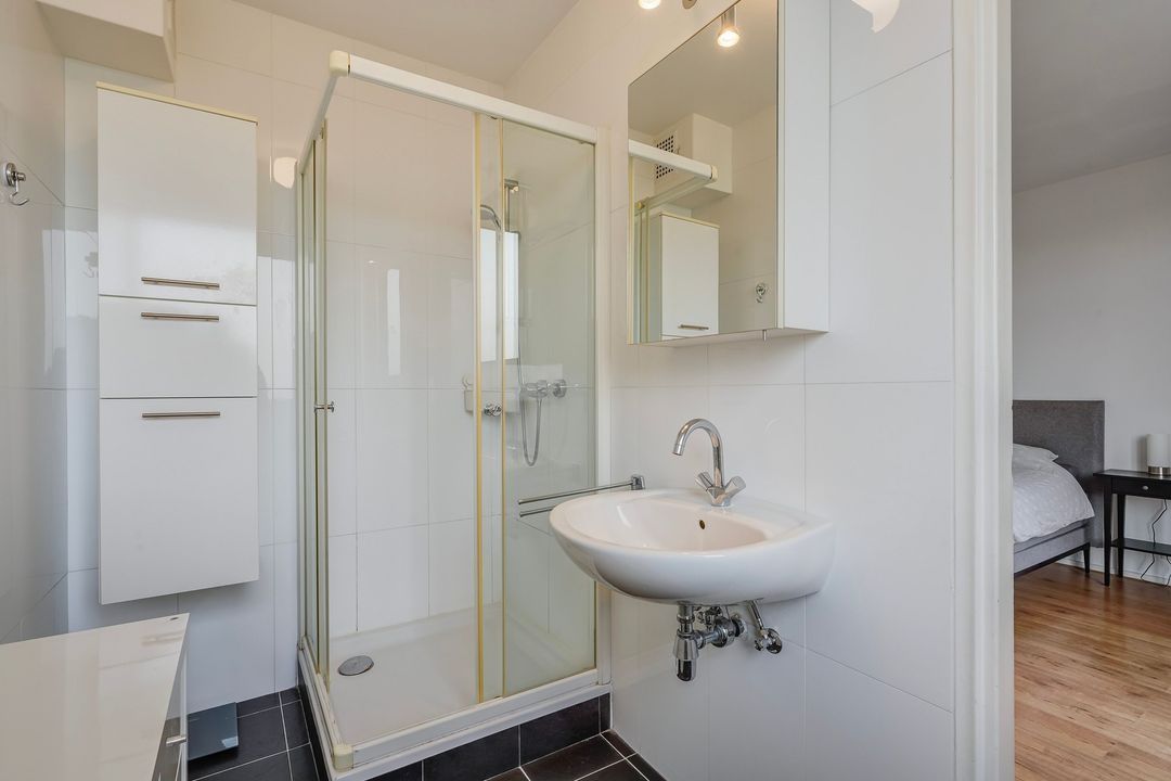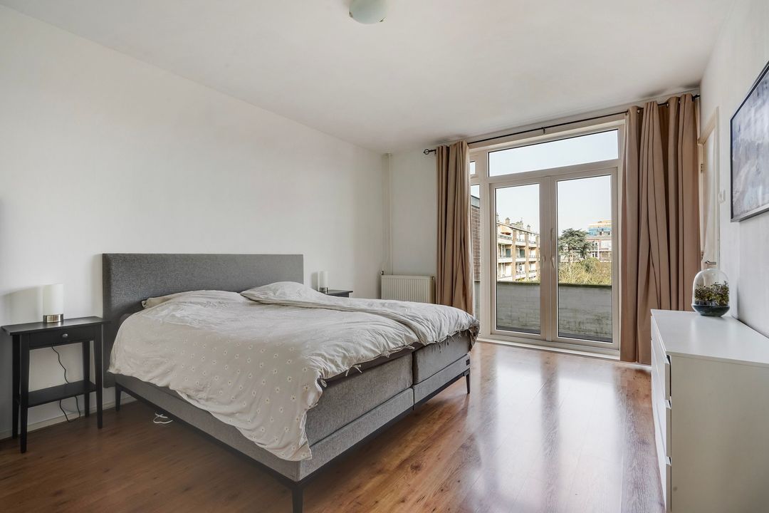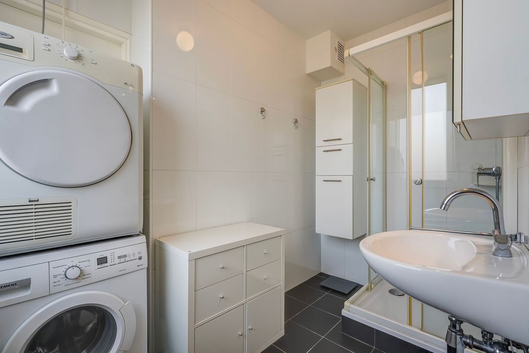 Royale achterslaapkamer met 2 vaste kasten en via dubbele deuren naar balkon voorzien van bergkast. Via deze slaapkamer toegang naar badkamer met douchecabine, wastafel en aansluiting wasmachine en droger.