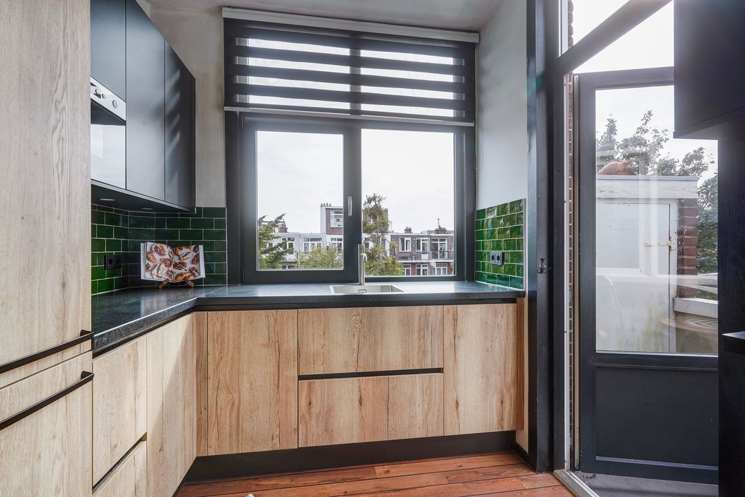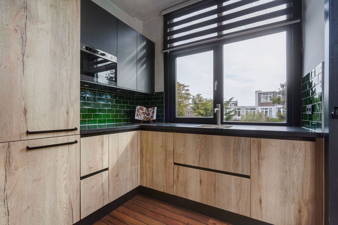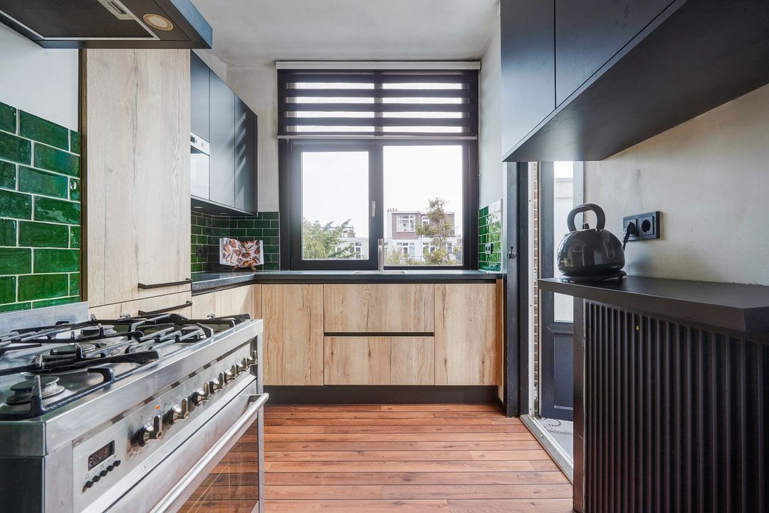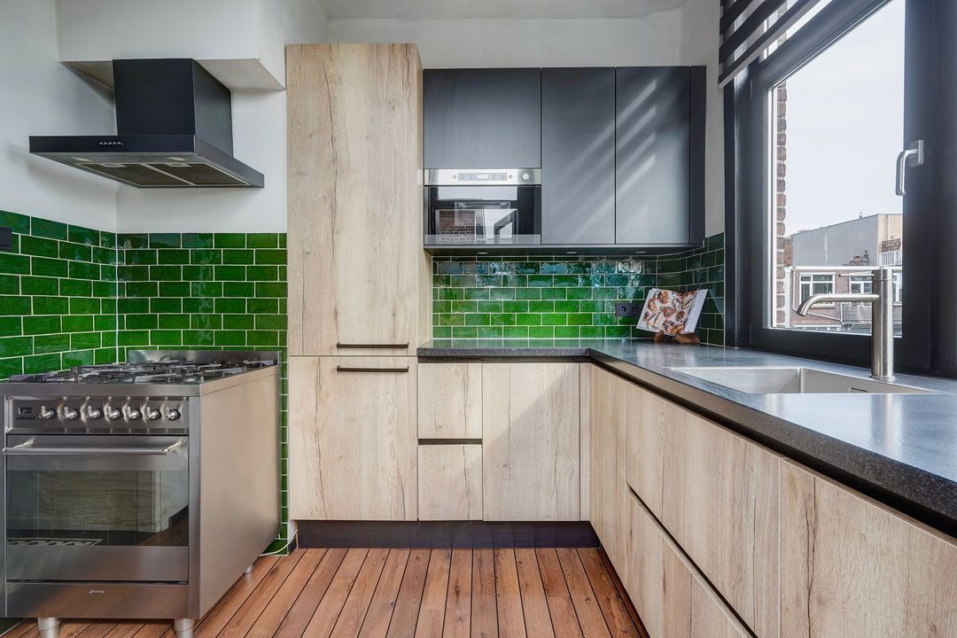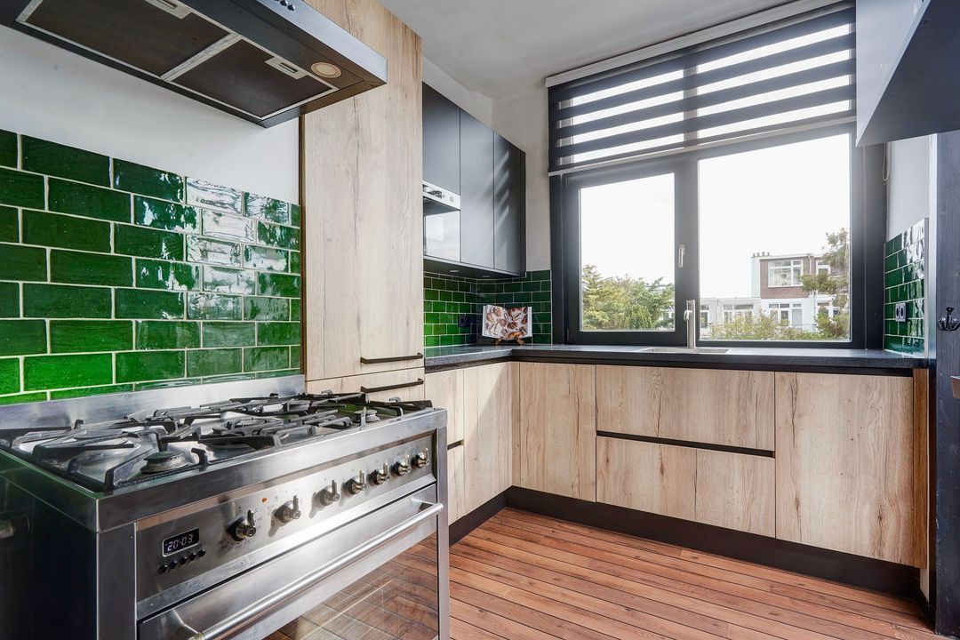 Moderne, dichte keuken aan de achterzijde (geplaatst in 2022) voorzien van een natuurstenen aanrechtblad, SMEG 6-pits gasfornuis met grote oven, afzuigkap, diverse inbouwapparatuur waaronder een koel/vriescombinatie, vaatwasser en (stoom)magnetron, veel opbergruimte (waaronder een carrouselkast) en deur naar zonnig achterbalkon met vaste kast, gelegen op het zuidoosten/westen met vrij uitzicht op het groen.
