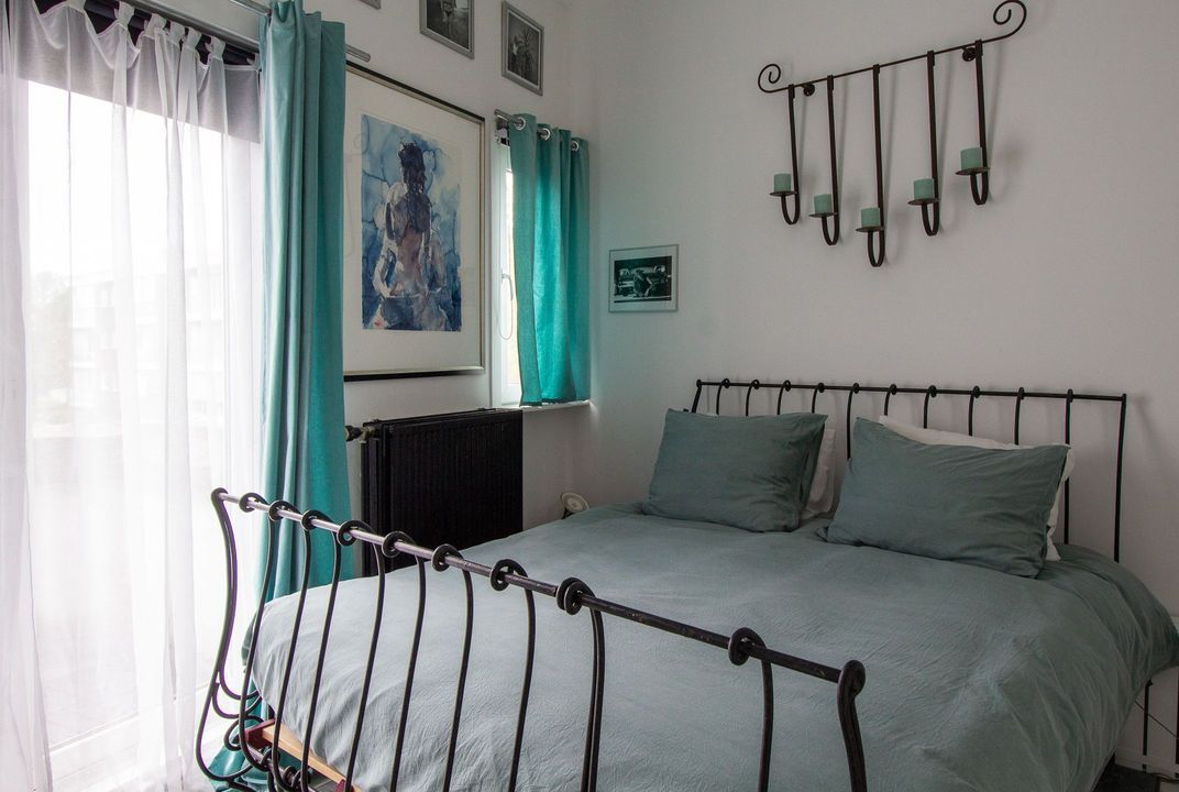 Ruime voorslaapkamer voorzien van originele houten vloerdelen, op maat gemaakte inbouwkast en tevens openslaande deuren naar het voorbalkon.