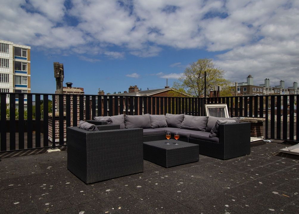 Vanuit de hal via spiltrap en daklicht toegang tot het fraaie dakterras, voorzien van draintegels en een gepoedercoat hekwerk met een waanzinnig vrij uitzicht over de wijk en de stad.