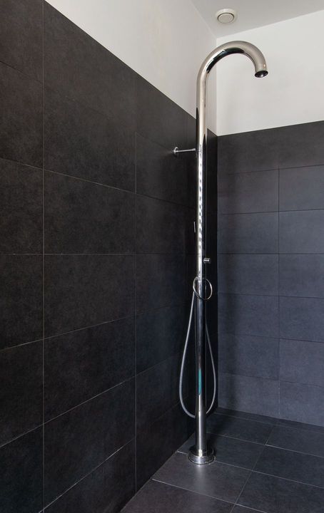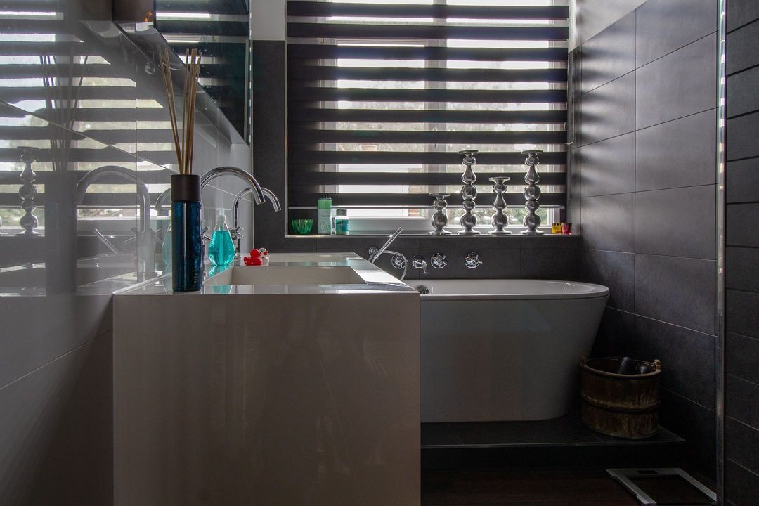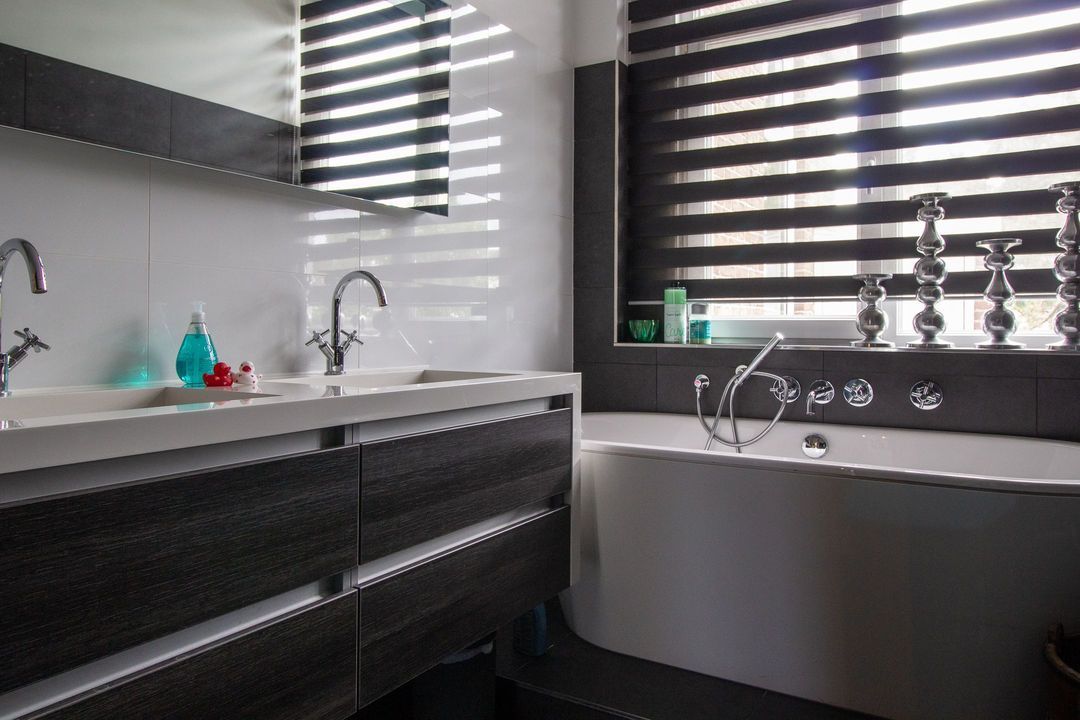 Ruim opgezette, geheel betegelde badkamer aan de achterzijde (voorheen slaapkamer) voorzien van een vrijstaand ligbad, royale inloopdouche (Jee-O buitendouche), dubbel wastafelmeubel, badkamerspiegel met ledverlichting, inbouwspots en designradiator.