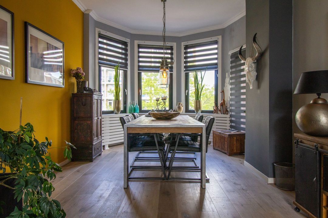 Ruime, lichte en doorgebroken woon/eetkamer (voormalig en suite, 12,5 meter lang en 2.88 meter hoge plafonds) voorzien van fraaie eikenhouten vloer, gashaard, karakteristieke voorerker met vrije doorkijk door de straat, deur naar voorbalkon, gelegen op het noordwesten met avondzon. Er is een mogelijkheid om de woonkamer op te splitsen in een extra slaapkamer.