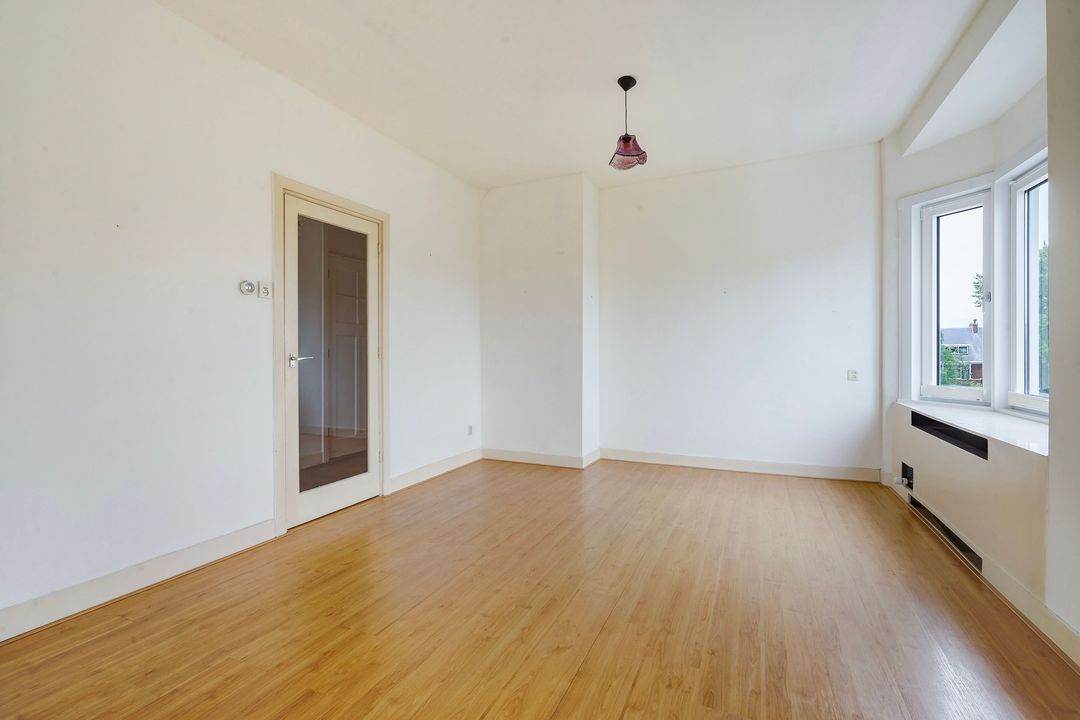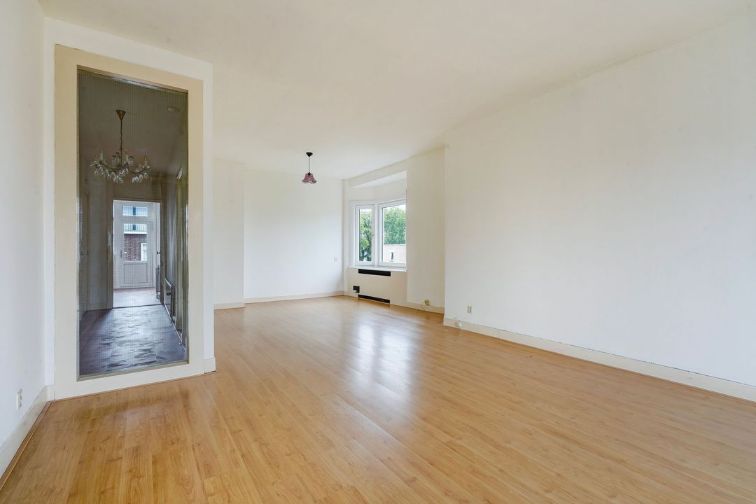 Lichte woon-/eetkamer op de hoek gelegen voorzien van hoge plafonds en grote raampartijen (waaronder 2 erkers en een zijraam) met vrije doorkijk naar de Rozenstraat.