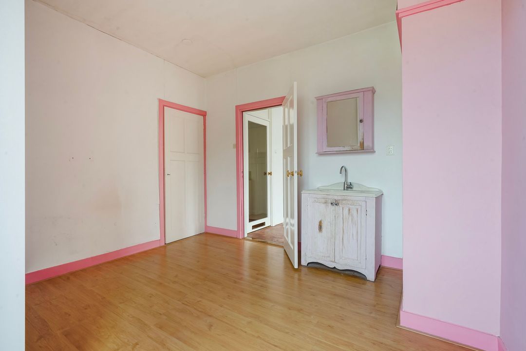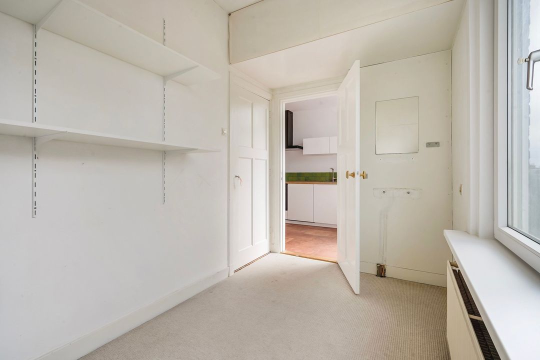 The kitchen provides access to the bedrooms, including a spacious intermediate bedroom with a vanity, mirrored cabinet, wall-to-wall wardrobe, and built-in closet. A second rear bedroom also has a built-in closet and unobstructed views on the Laan van Meerdervoort.
