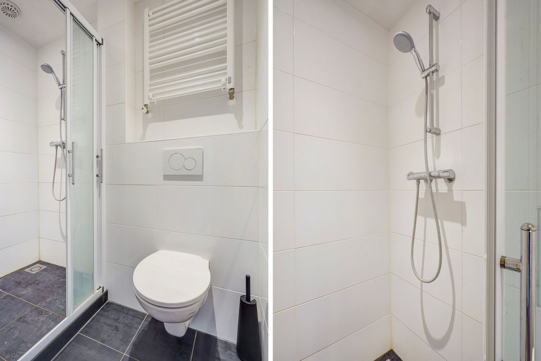 Entree appartement, ruime overloop, meterkast, geheel betegelde moderne toilet-/douchecombinatie met handdoekradiator en vaste kast met opstelplaats cv-ketel en wasmachineaansluiting.