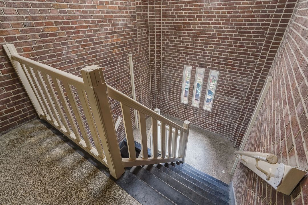 Stairs lead to the second floor through a beautiful open porch with granite floors and stained-glass skylights.