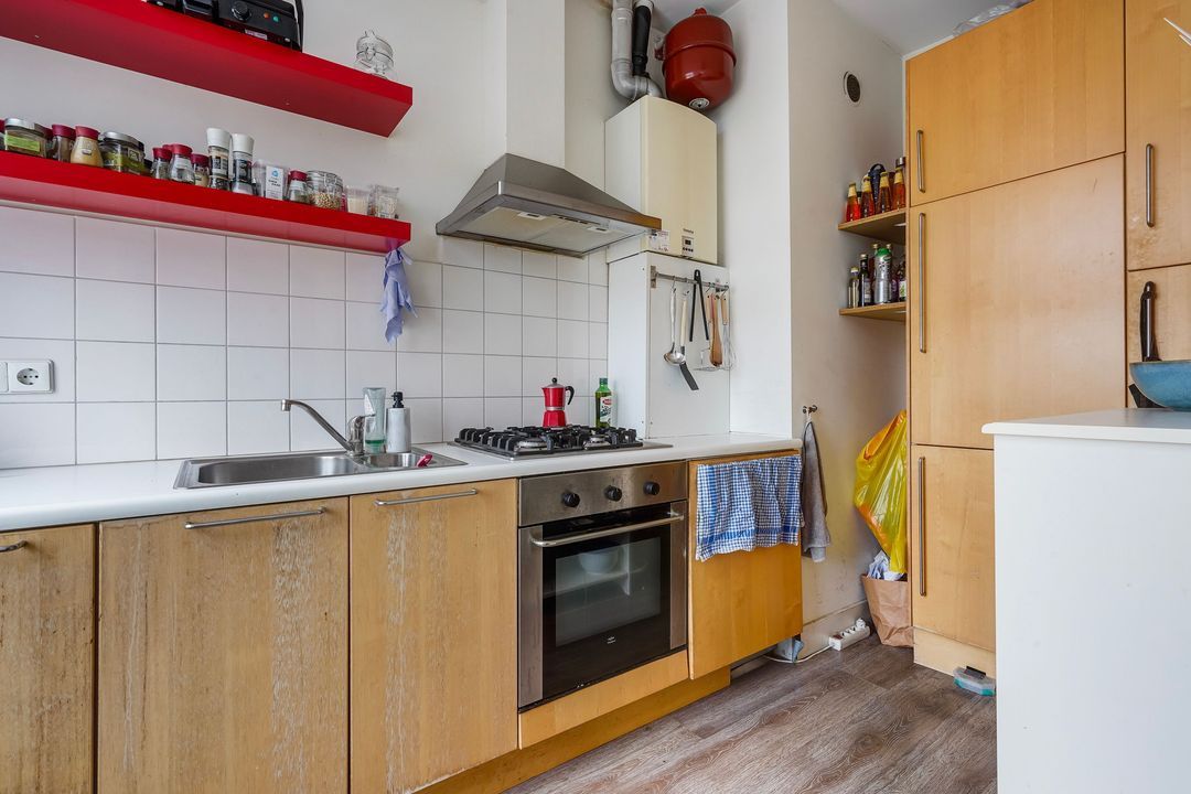 Open doorgang naar de keuken voorzien van afzuigkap, 4-pits gasfornuis, oven, vaatwasser, koel-/vrieskast en opstelplaats van de c.v.-combiketel.
