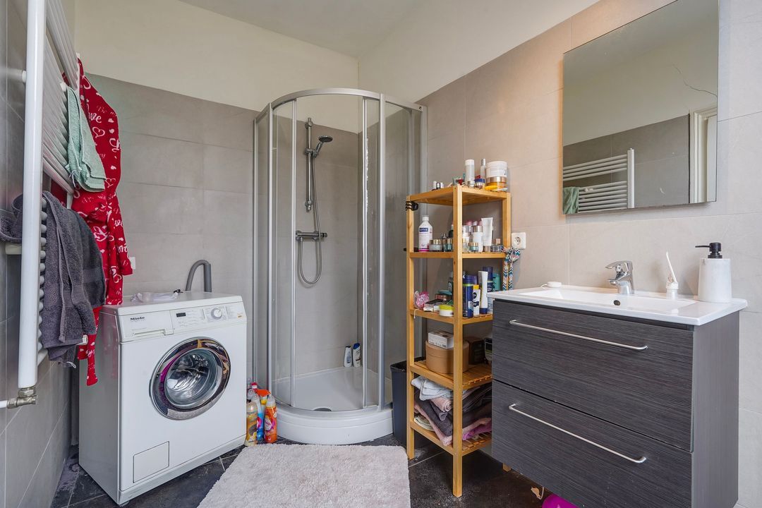 Nette badkamer voorzien van wasmachine aansluiting, douche en badkamermeubel.