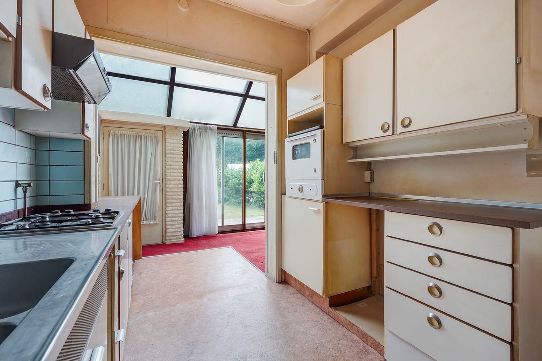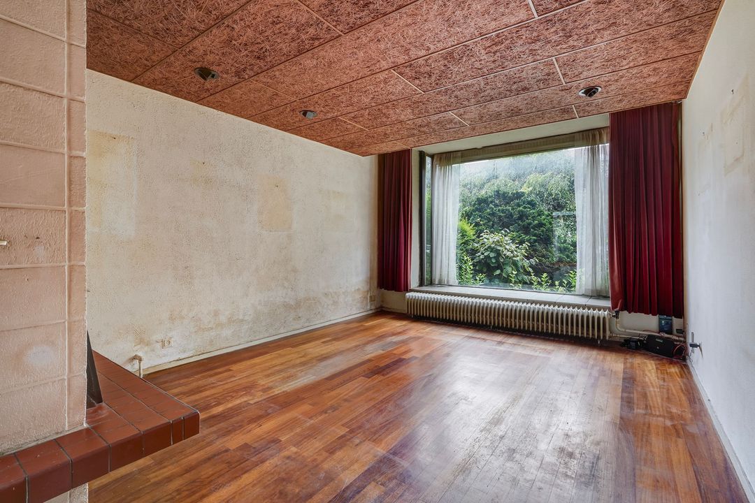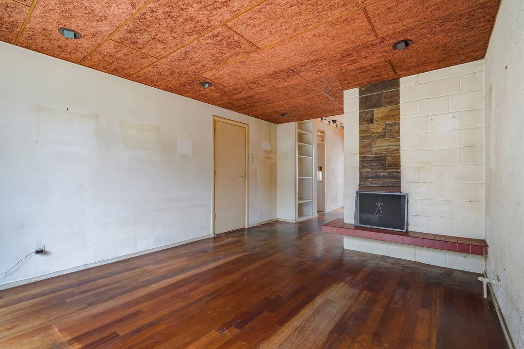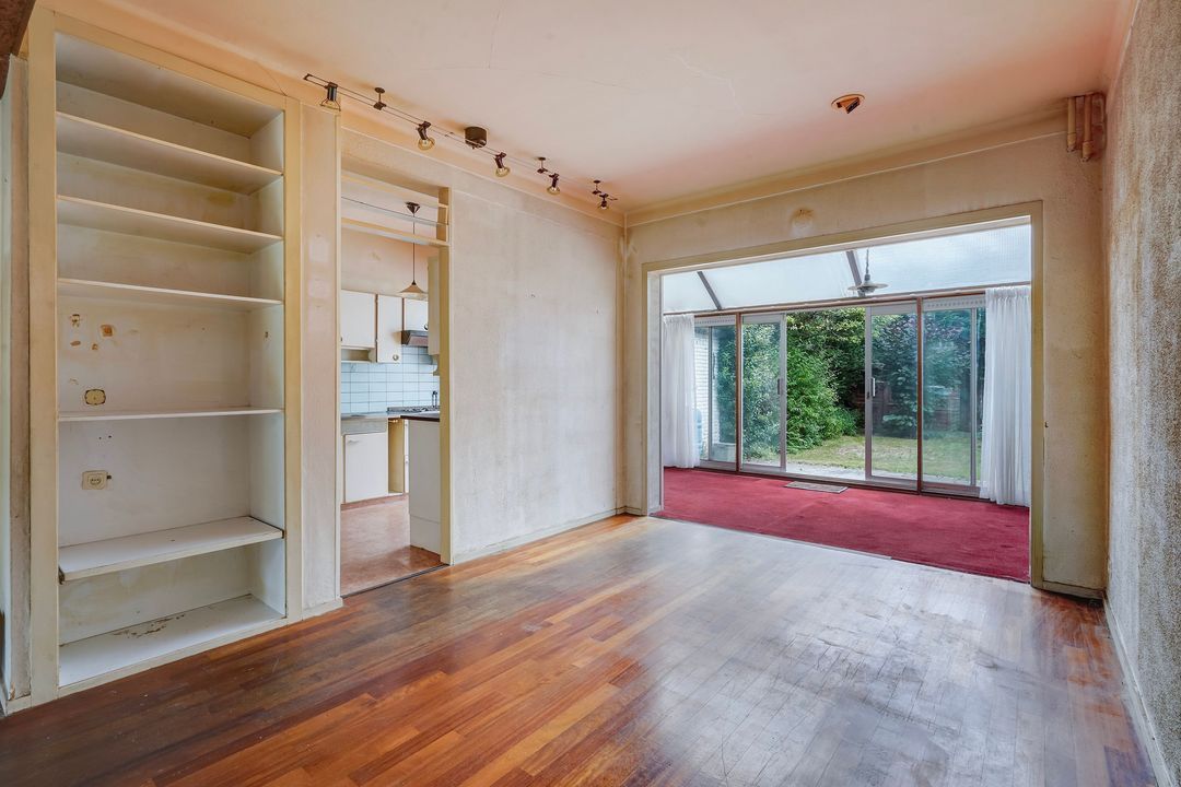 Ruime, doorgebroken woon-/eetkamer voorzien van houten vloer, voorerker, open haard, halfopen keuken (ook bereikbaar vanuit de gang), uitbouw met aangebouwde stenen berging.