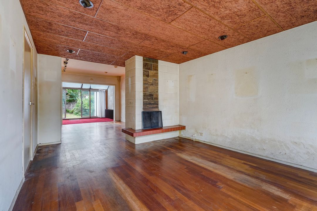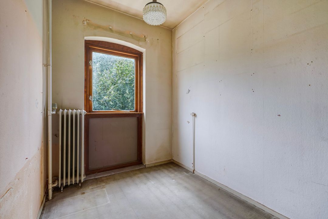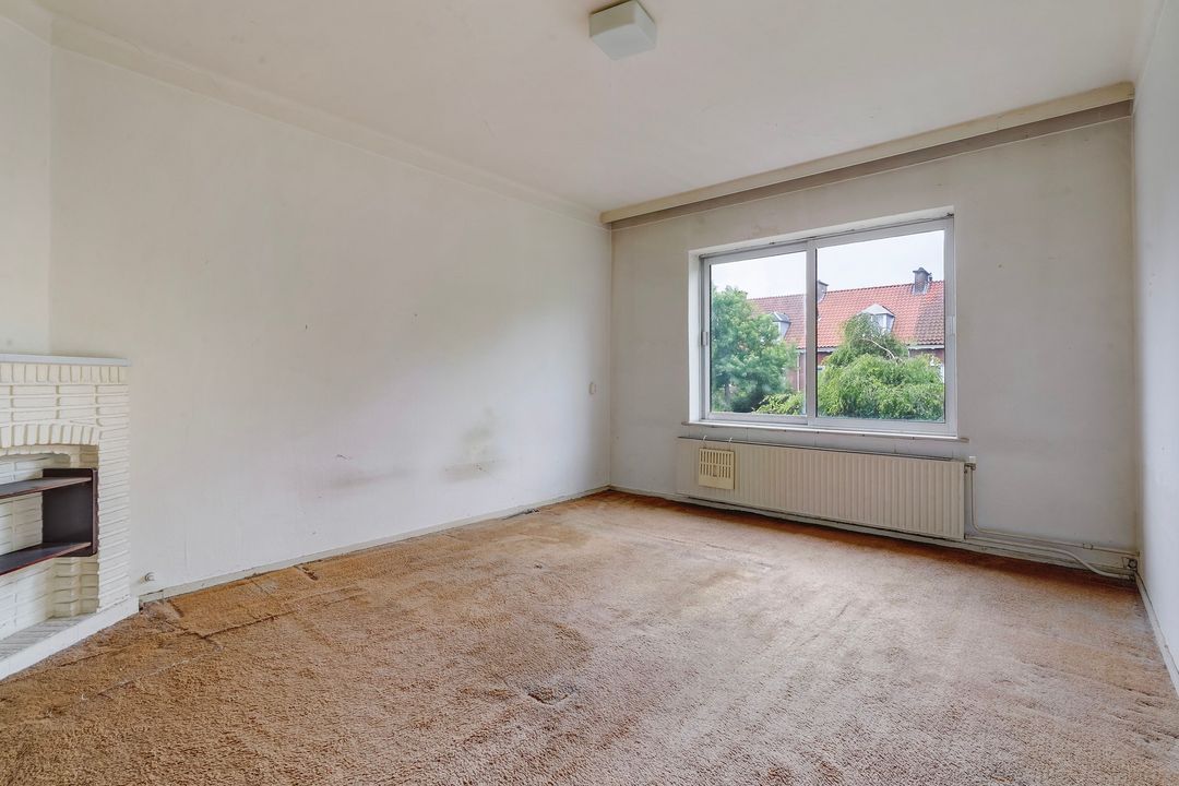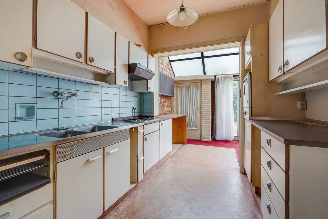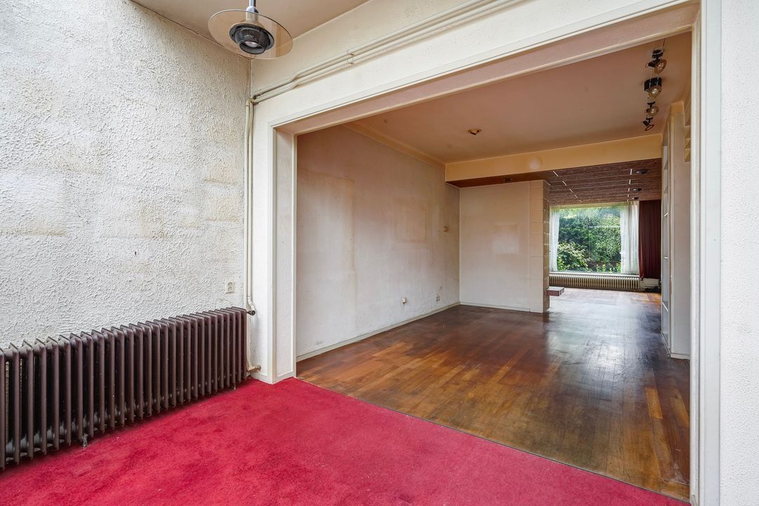 Ruime, doorgebroken woon-/eetkamer voorzien van houten vloer, voorerker, open haard, halfopen keuken (ook bereikbaar vanuit de gang), uitbouw met aangebouwde stenen berging.