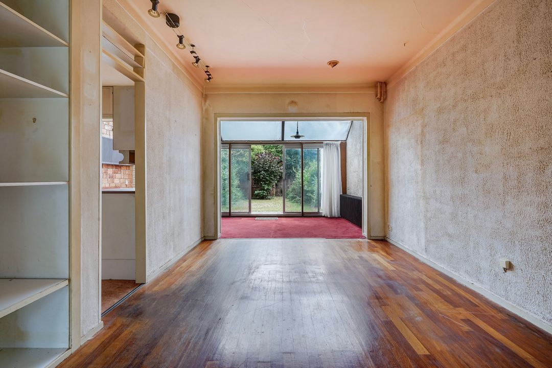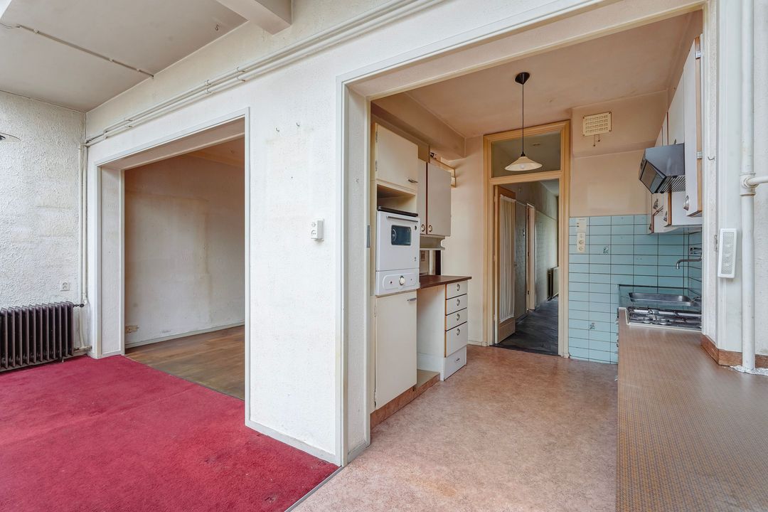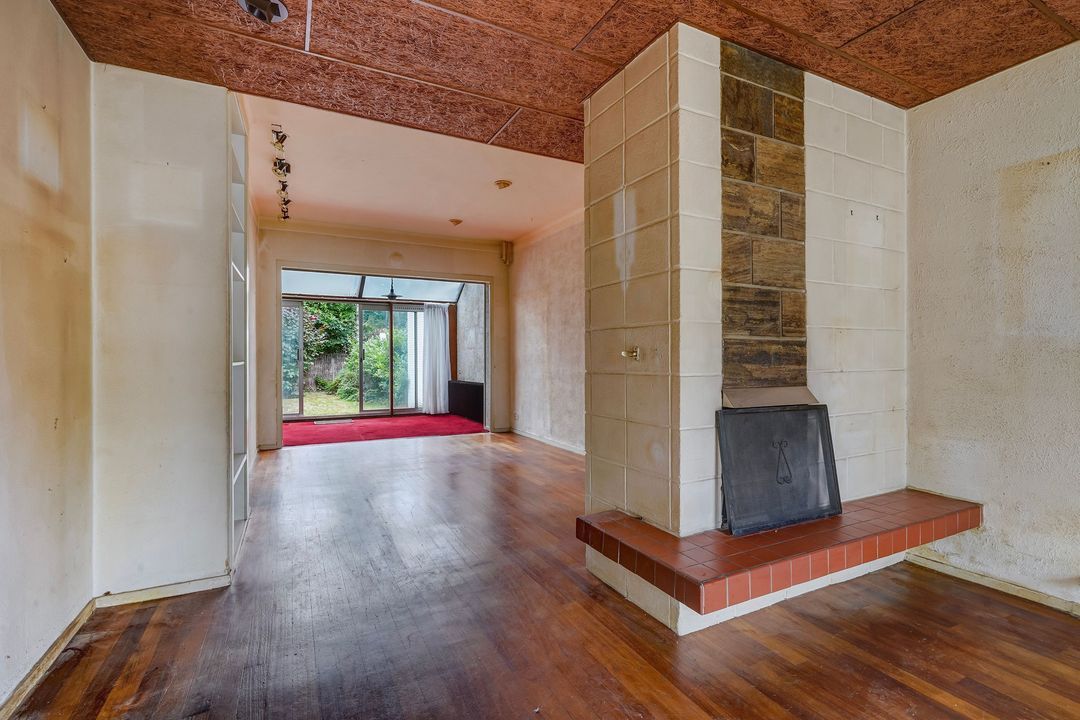 Spacious broken-through living-/dining room with wooden flooring, a bay window, fireplace, semi-open kitchen (also accessible from the hallway), and an extension with an attached stone shed.