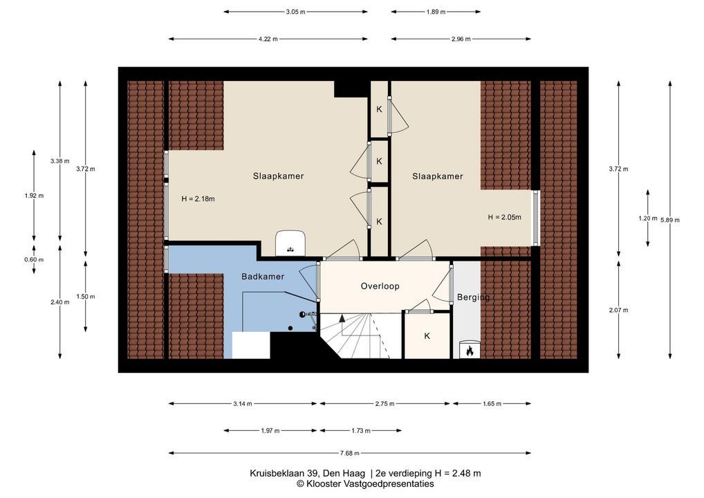 Overloop, bergruimte met opstelplaats cv-ketel en 2e badkamer met douche. Voorslaapkamer met dakkapel en 1 vaste kast. Achterslaapkamer met dakkapel, een wastafel en 2 vaste kasten.