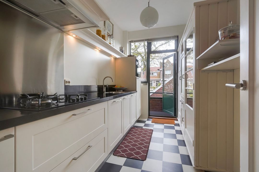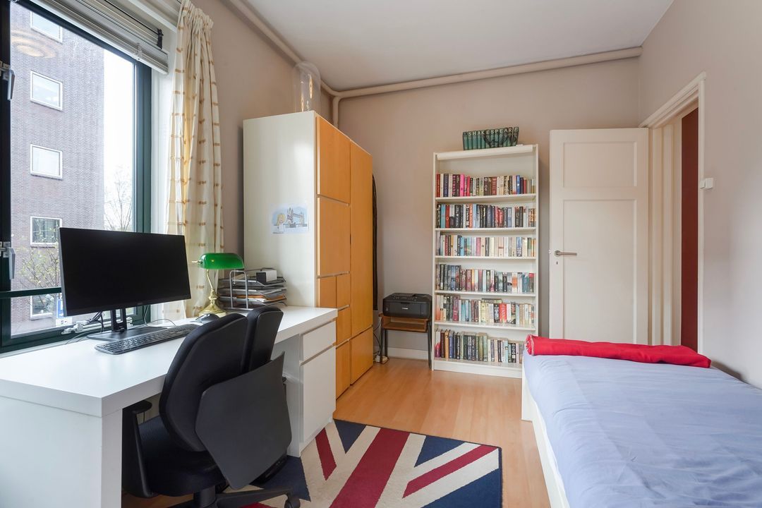 Twee in elkaars verlengde liggende achterslaapkamers met in de laatste slaapkamer een wastafelmeubel en vaste kast. Tevens deur naar het zonnige balkon op het zuidoosten met balkonkast. Moderne keuken met originele jaren 30-servieskast, diverse Siemens-apparatuur waaronder een koelkast, vaatwasser en combimagnetronoven en deur naar balkon.