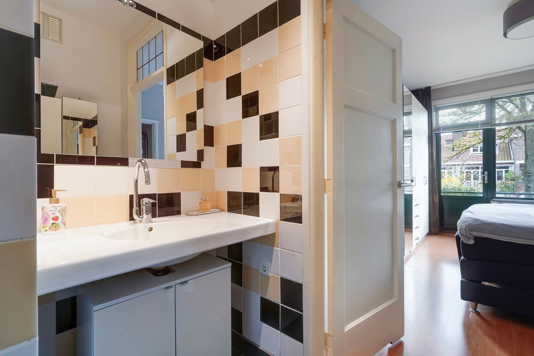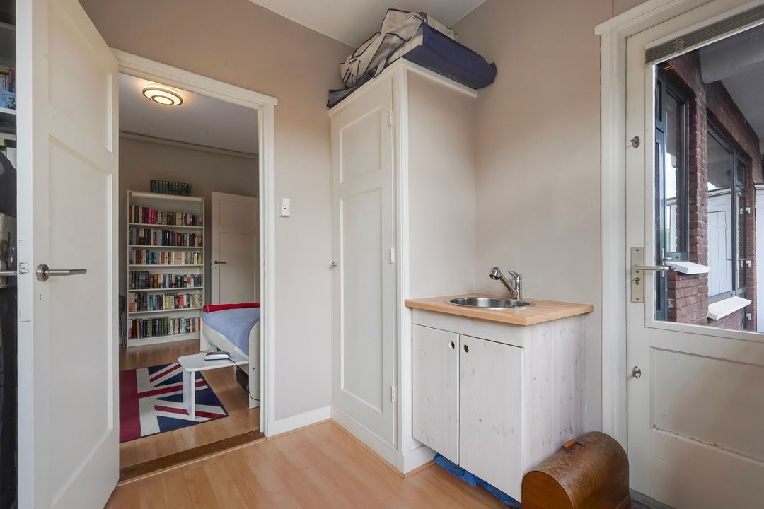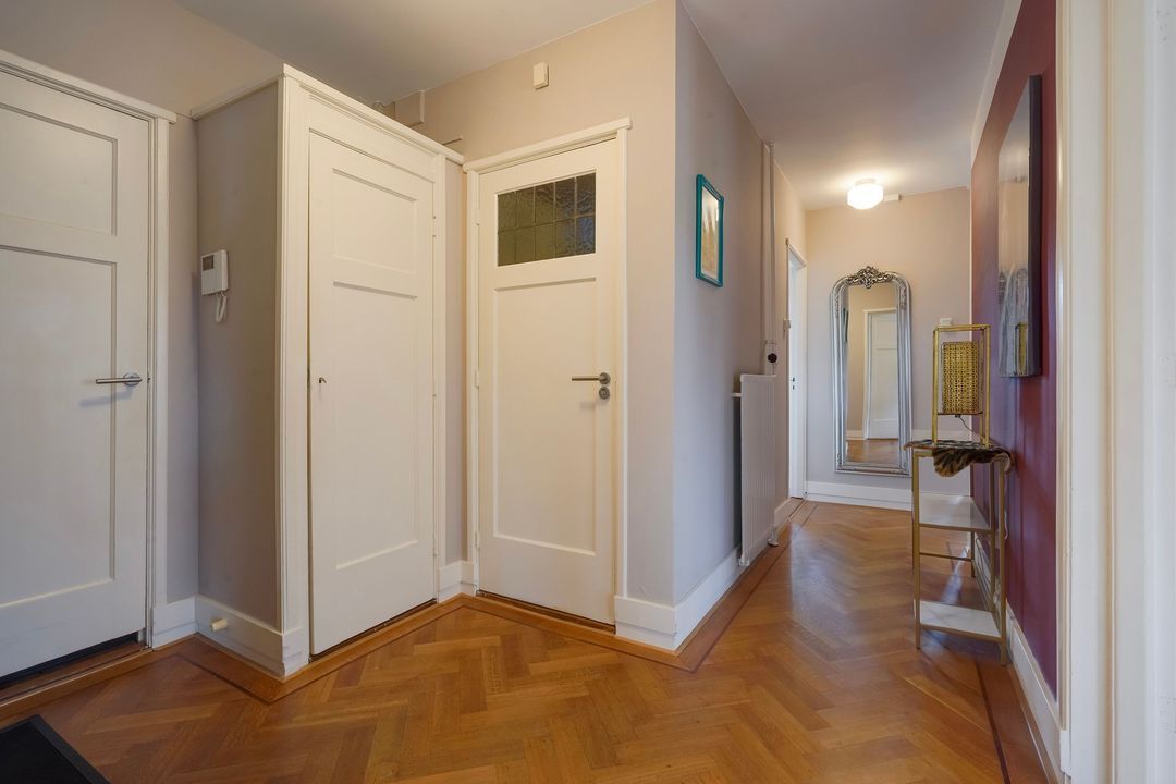 Via kleinschalig verzorgd en gesloten portiek en trappenhuis naar 1e verdieping. Entrée appartement met videofoonsysteem, gang voorzien van originele visgraat parketvloer met bies, aparte wasruimte met aansluiting wasmachine/droger, opstelplaats cv en garderobekast. Separaat toilet met fontein en deur naar nette badkamer voorzien van inloopdouche, wastafel en handdoekenradiator.