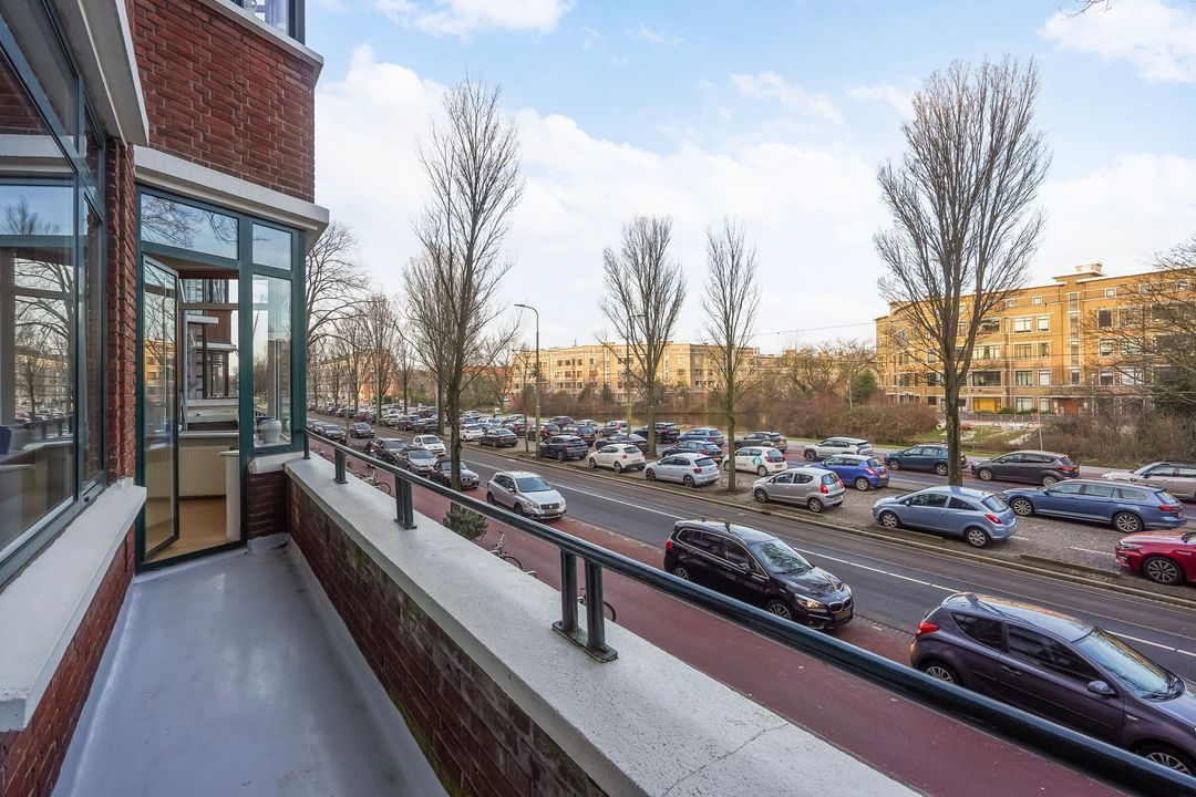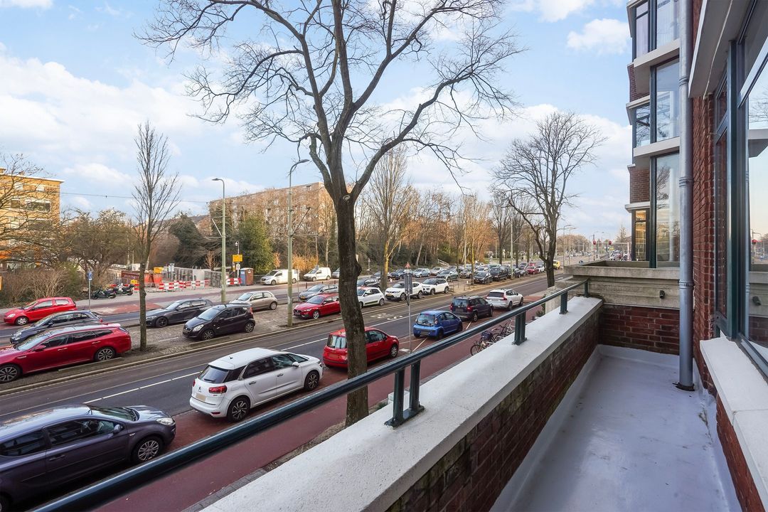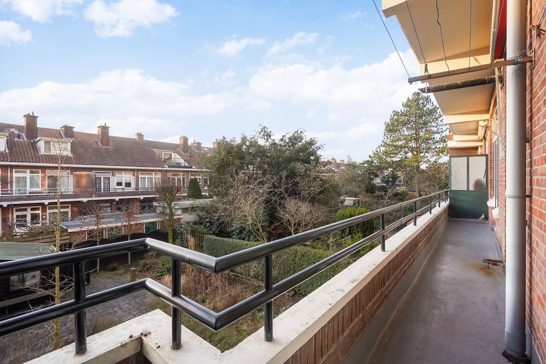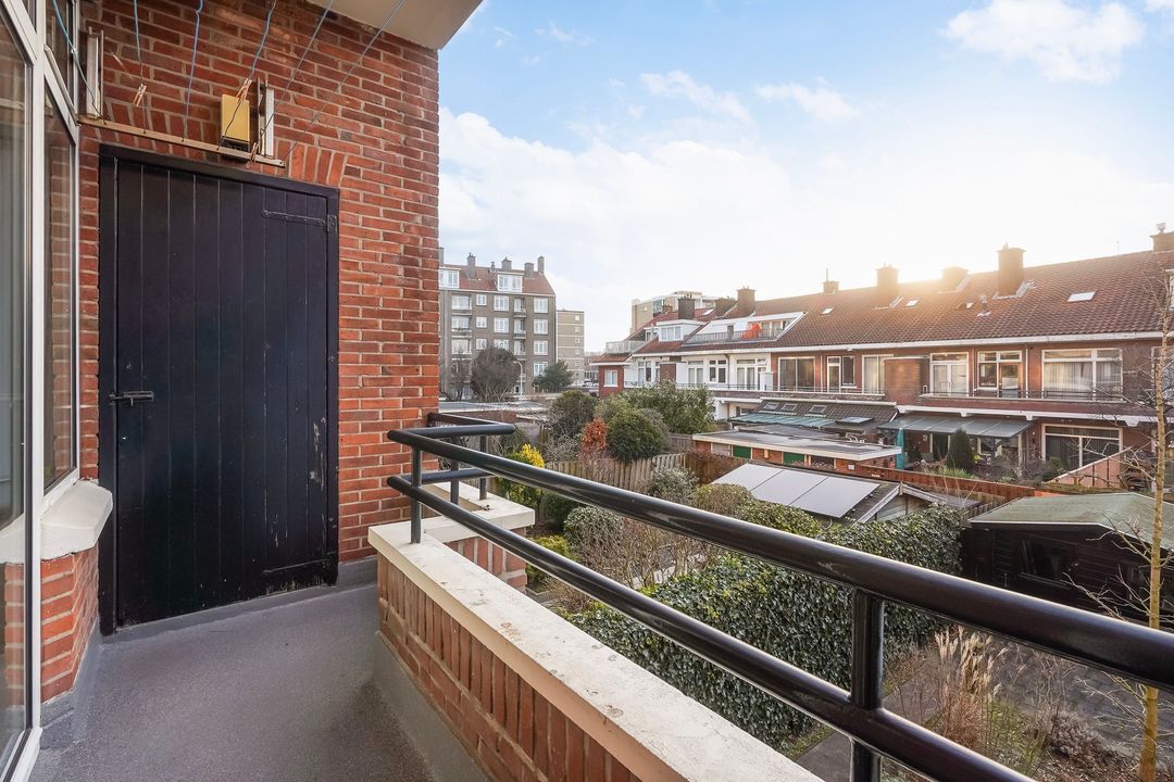 Vanuit de achterkamer via openslaande deuren toegang tot het riante achterbalkon, gelegen over de gehele breedte op het zuidoosten met ochtend- en middagzon, met zonwering en balkonkast.