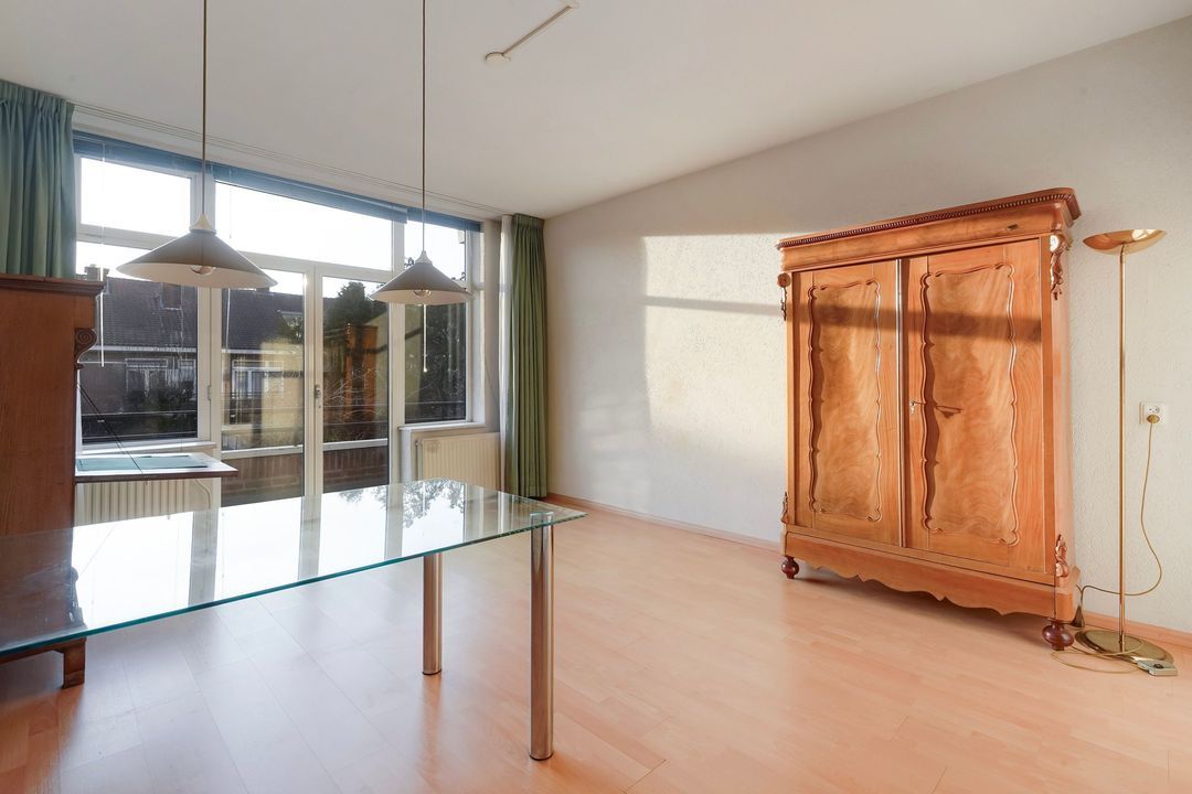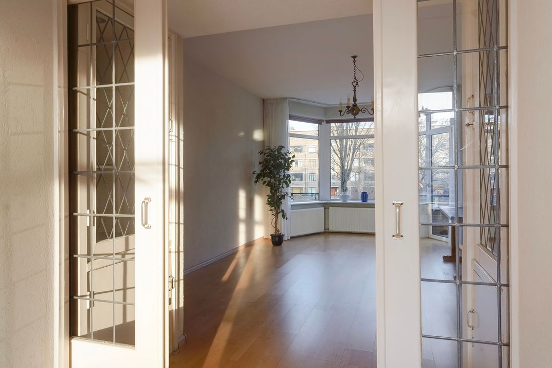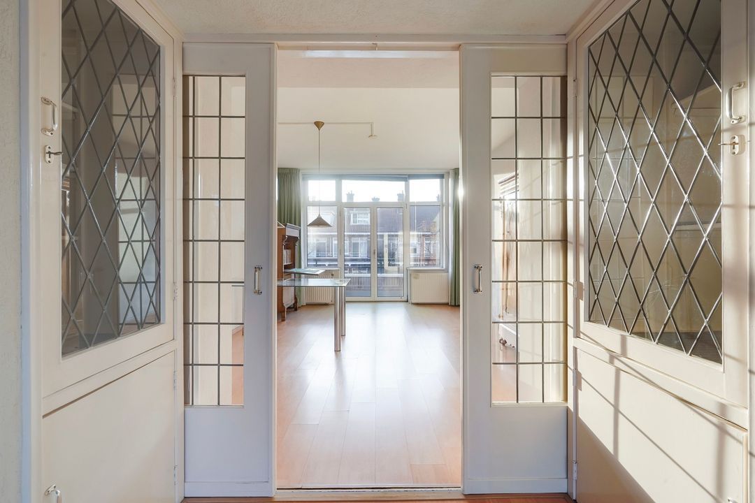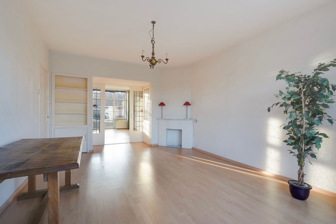 Prachtige woonkamer en suite (lengte ca. 11.30 m) met originele schuifdeuren met glas in lood, 4 vaste kasten (waarvan 2 met glas in lood), karakteristieke voorerker met vrij uitzicht en tevens deur naar het voorbalkon, gelegen op het noordwesten met avondzon.