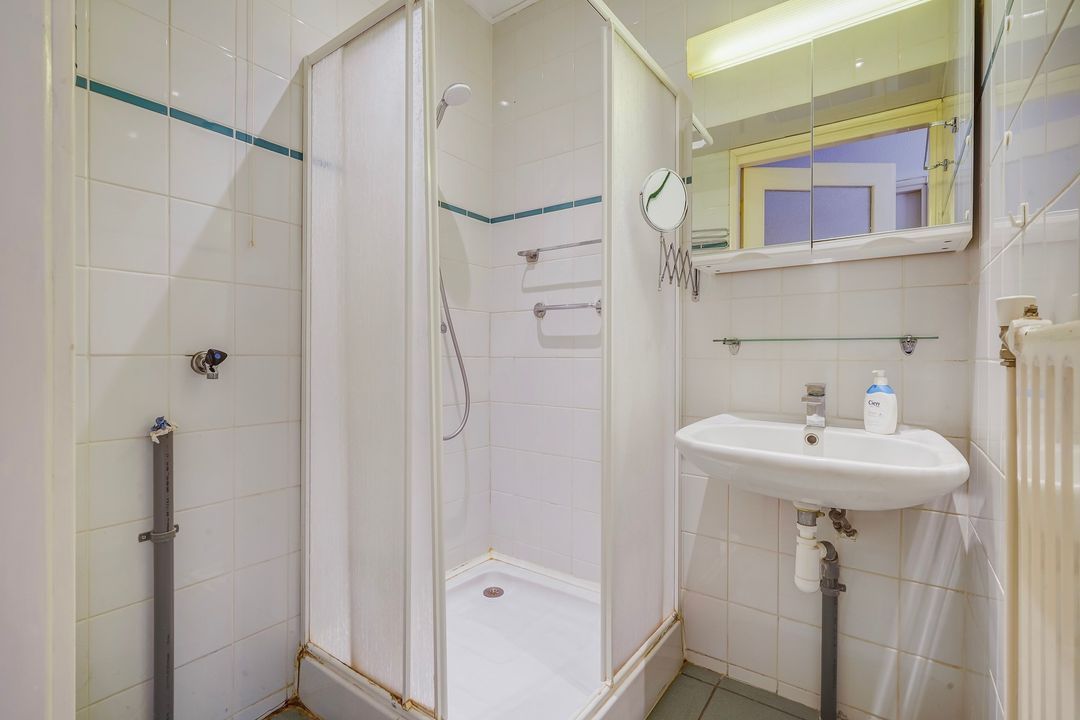 Apartment entrance, L-shaped hallway with access to all rooms, the meter cupboard and a separate toilet with a hand basin. Fully tiled bathroom with a shower, sink, mirror cabinet and washing machine connection.