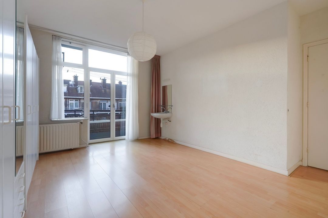 Bijzonder ruime ouderslaapkamer aan de achterzijde met wastafel, vaste kast en openslaande deuren naar het achterbalkon.