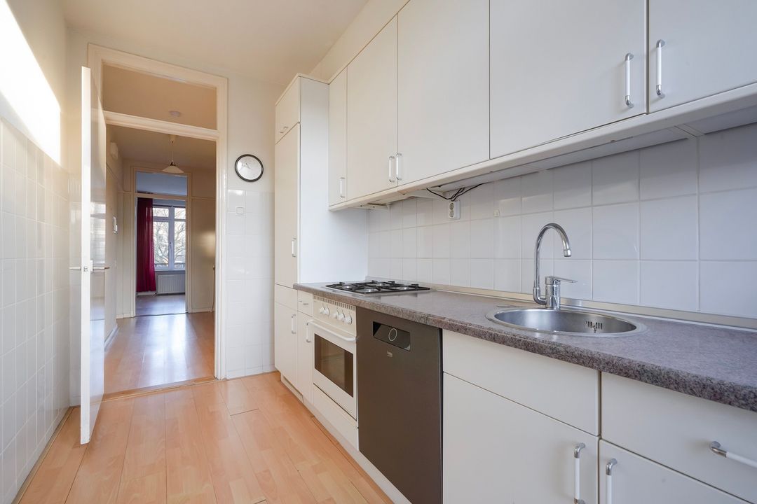 The well-maintained, closed kitchen is equipped with a 4-burner gas stove, oven, extractor hood, fridge/freezer, dishwasher, central heating boiler and a door to the rear balcony.