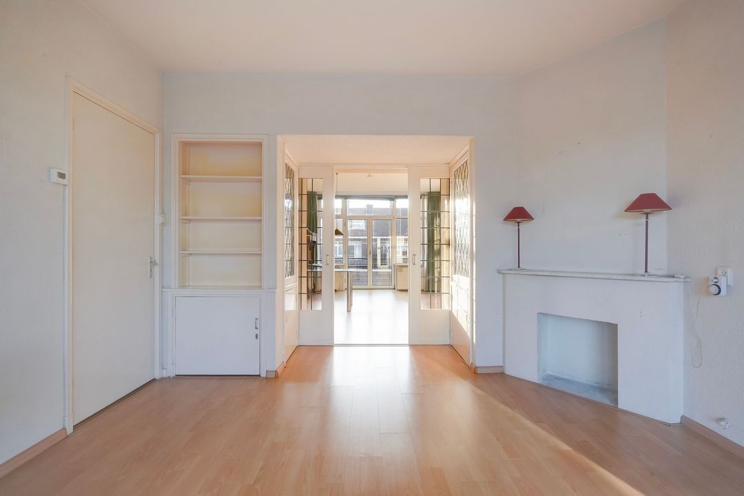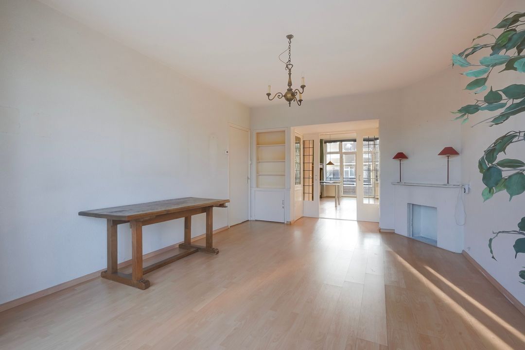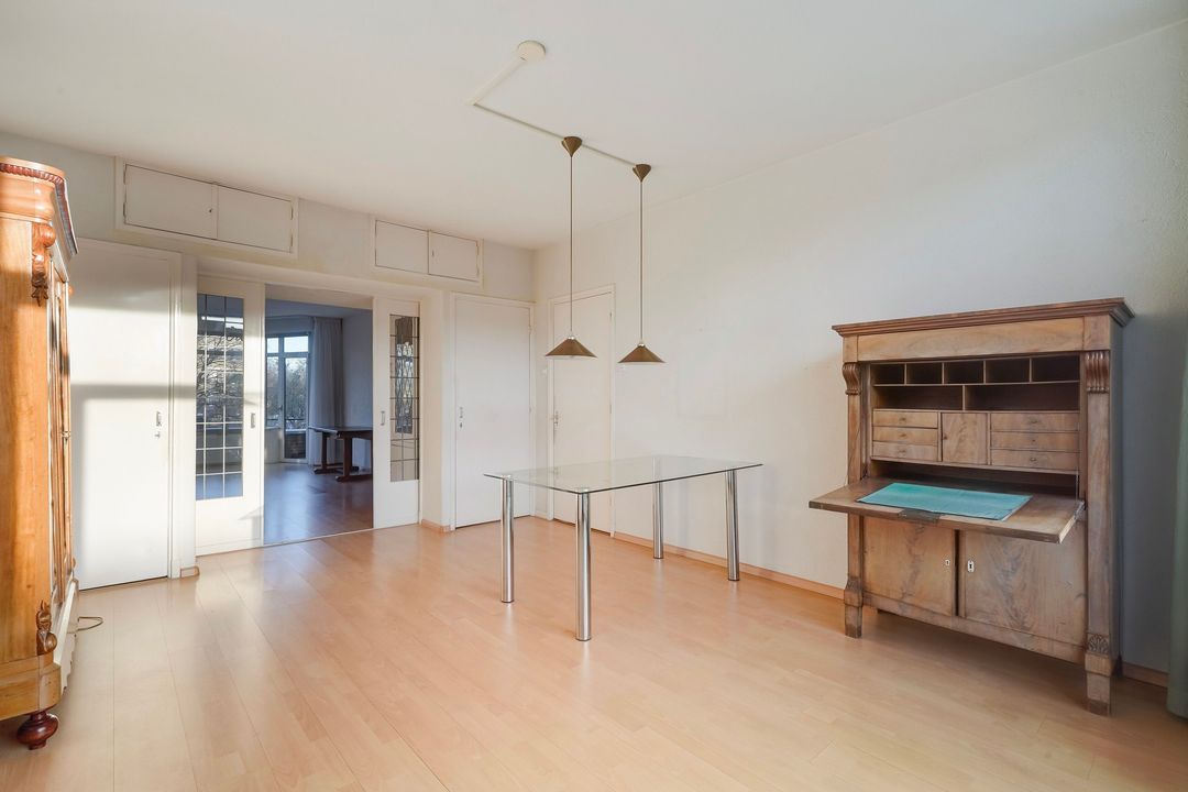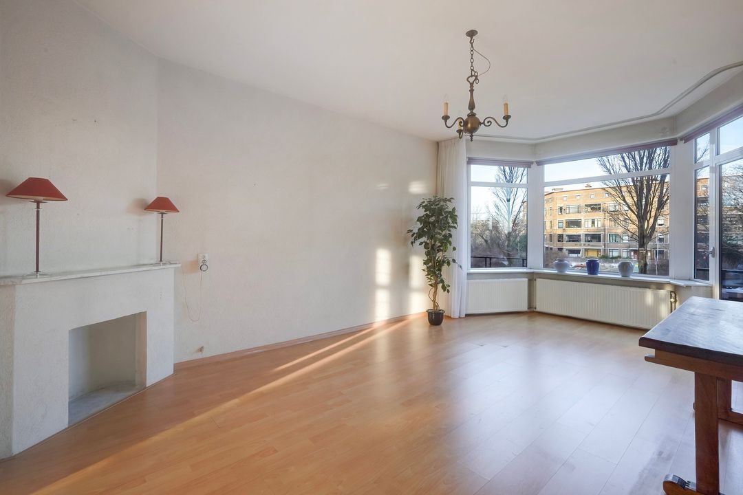 Prachtige woonkamer en suite (lengte ca. 11.30 m) met originele schuifdeuren met glas in lood, 4 vaste kasten (waarvan 2 met glas in lood), karakteristieke voorerker met vrij uitzicht en tevens deur naar het voorbalkon, gelegen op het noordwesten met avondzon.