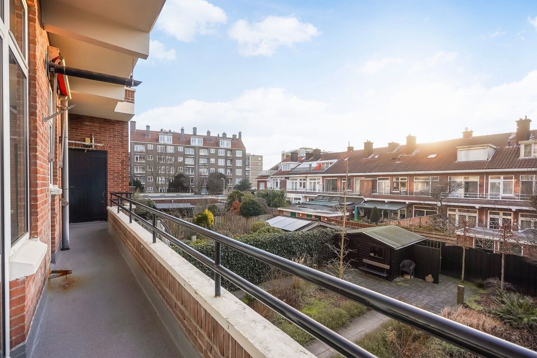 Vanuit de achterkamer via openslaande deuren toegang tot het riante achterbalkon, gelegen over de gehele breedte op het zuidoosten met ochtend- en middagzon, met zonwering en balkonkast.